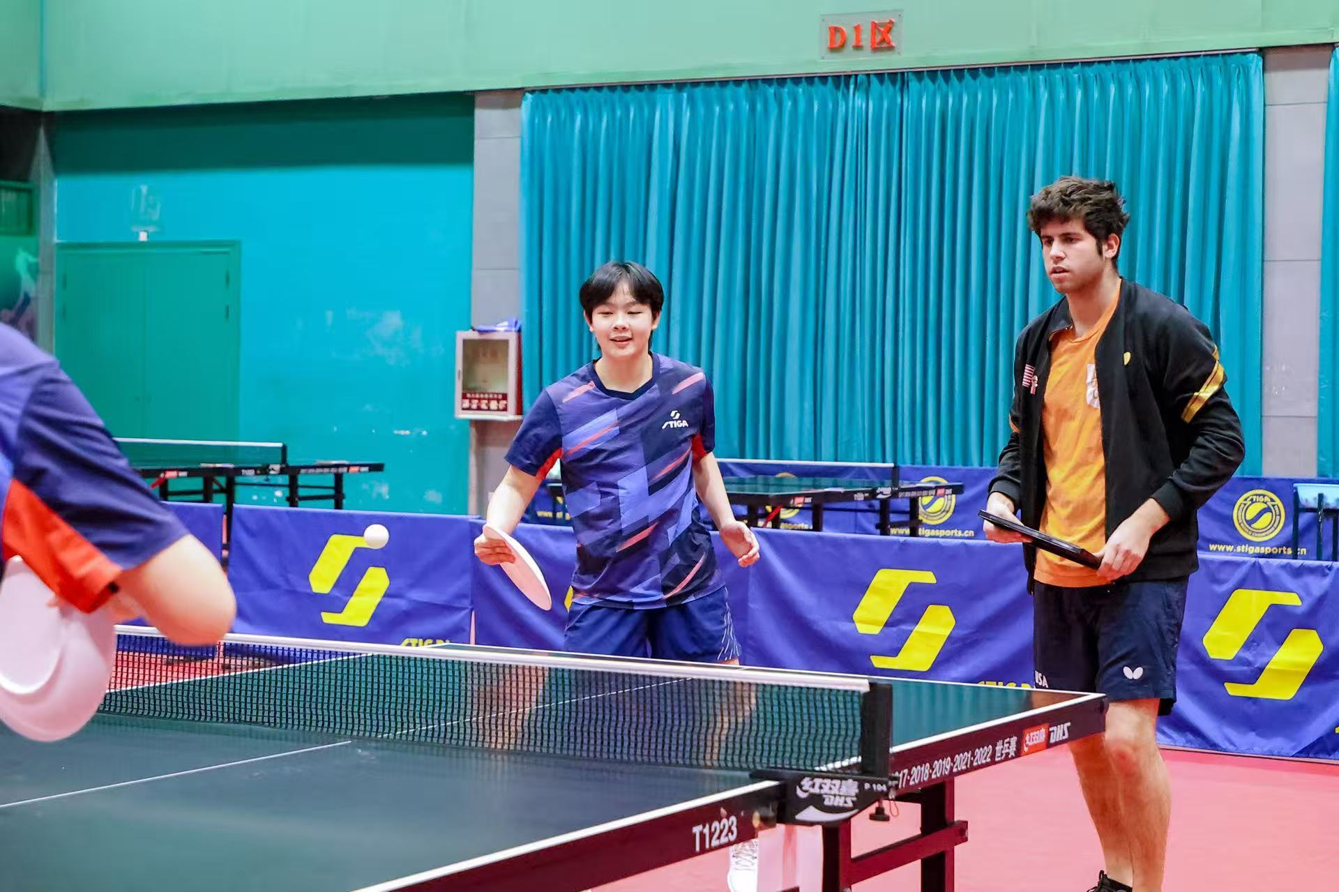 美國乒協(xié)注冊運動員凱?扎雷賓在正定國家乒乓球訓練基地與中國青少年球員開展友誼賽