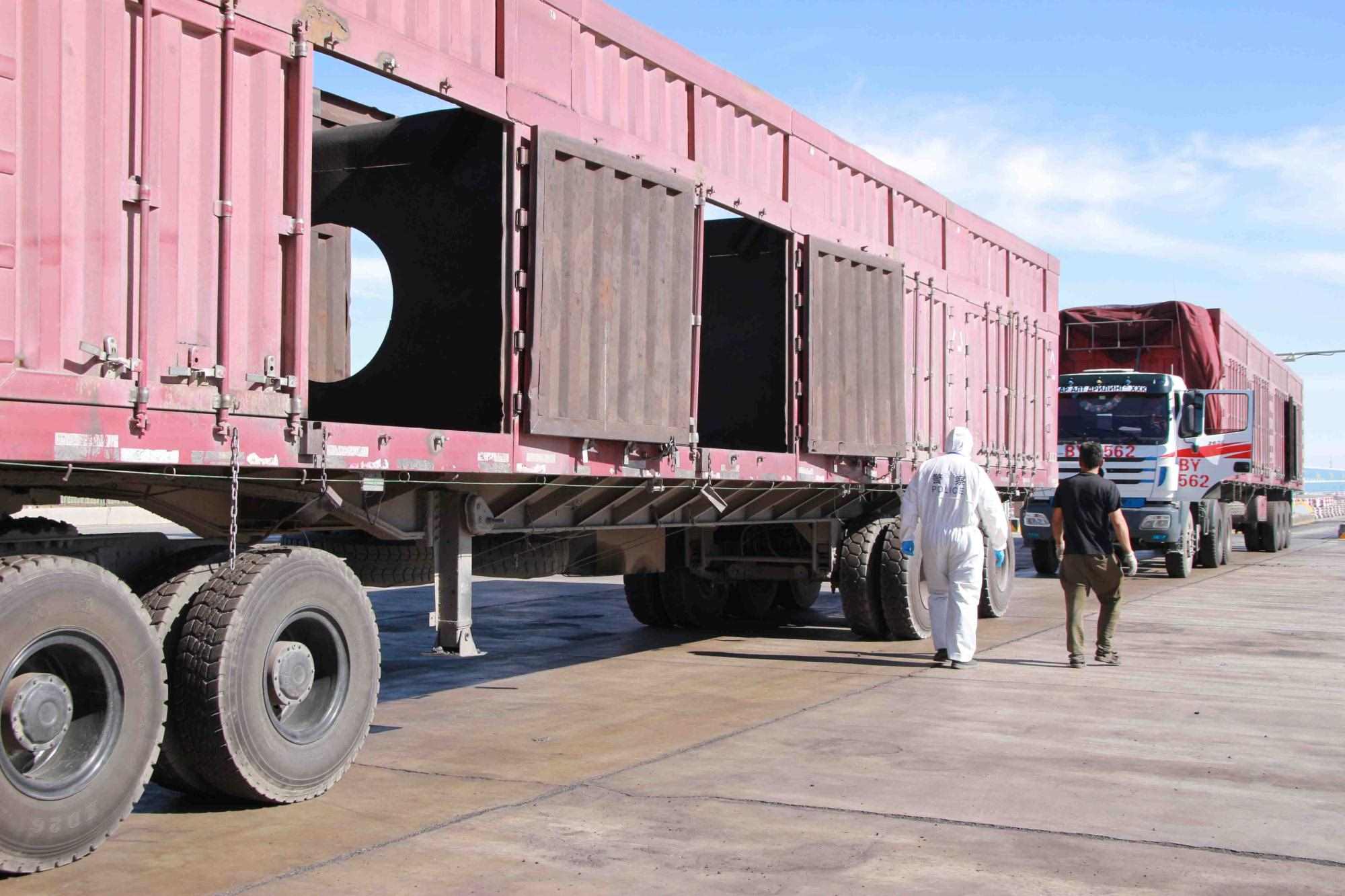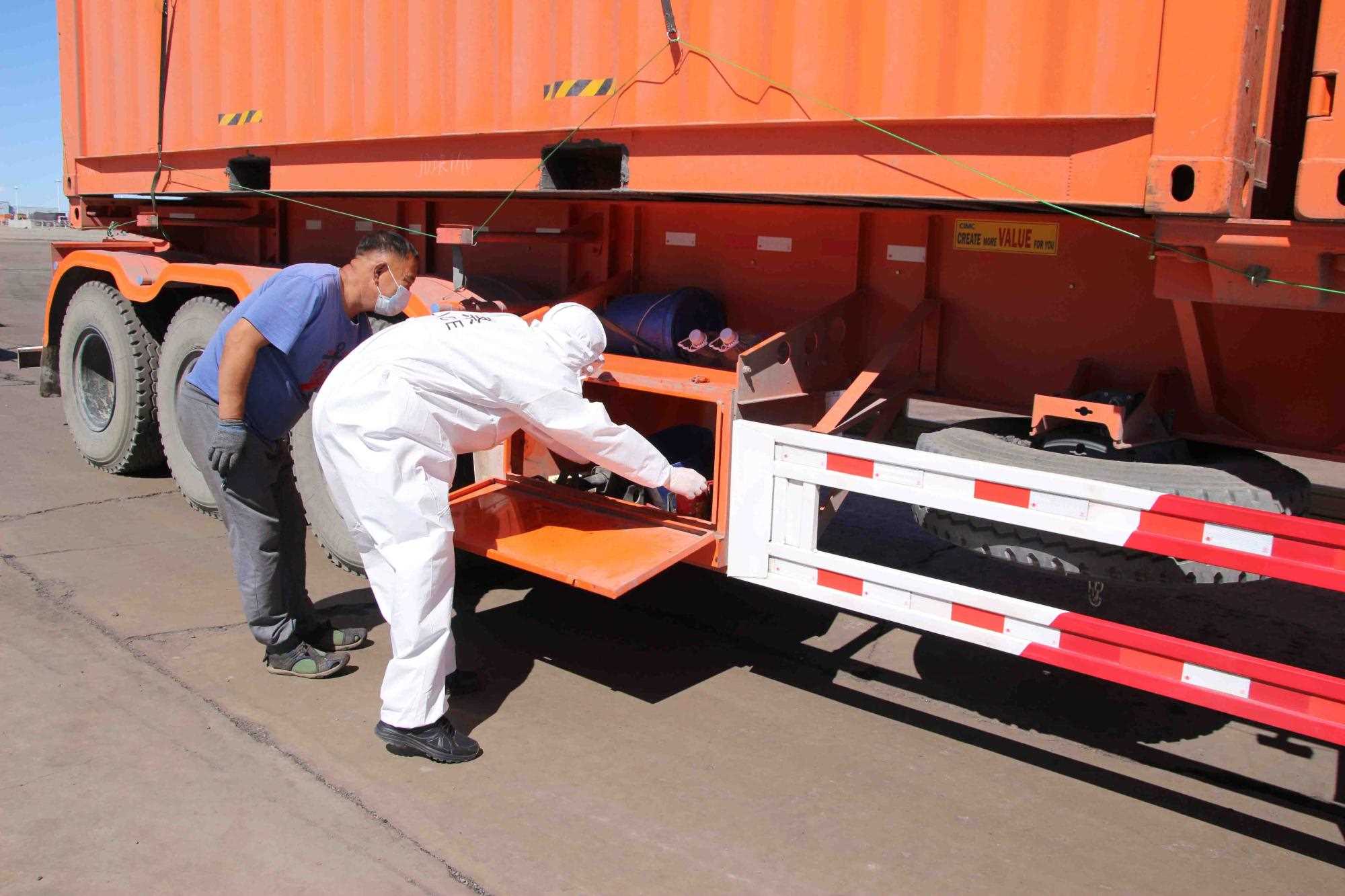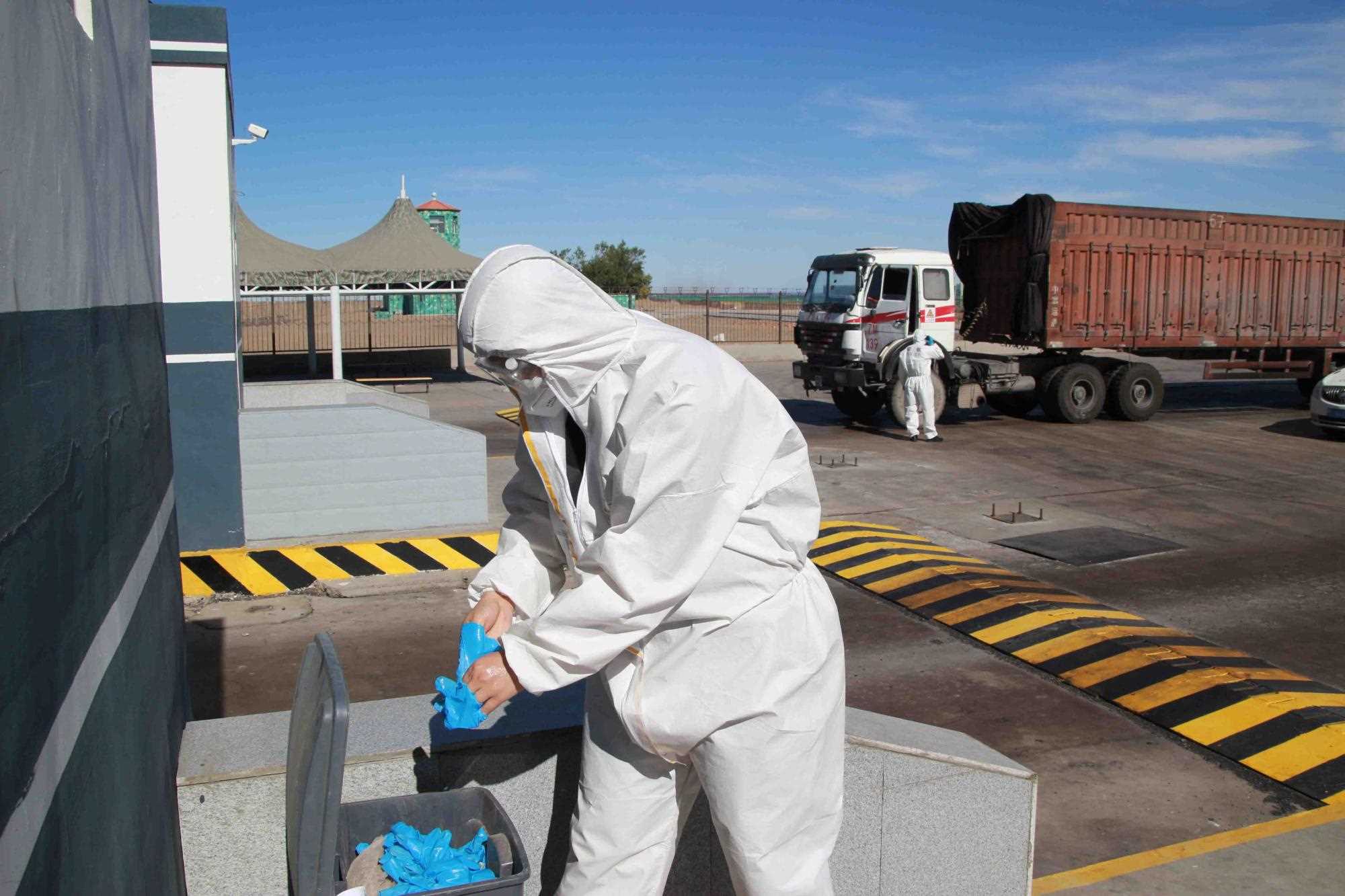 近期策克口岸的溫度持續(xù)增加至30攝氏度以上,而在通行的重型卡車,溫度還要更高,下午15點溫度計地表溫度測量最高可達40攝氏度。這無疑讓的查驗工作更為繁重。更重要的是,由于疫情影響每名民警在查驗期間都要穿上防護服,在高溫下,由于防護服是密閉的,防護服里仿佛成了蒸箱,用不了十分鐘,民警就會汗流浹背,防護服黏在身上又粘又癢,一班勤務近2個小時,必須要等過了勤務才能休息,而民警還要完成車體的查驗工作,包括工具箱、馬槽等處,絲毫不敢馬虎。