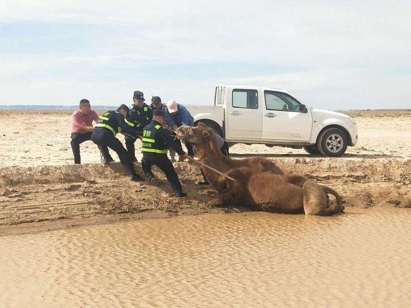 無(wú)獨(dú)有偶。當(dāng)日下午,阿拉善左旗蘇宏圖邊境派出所也接到群眾報(bào)警:稱其一峰駱駝陷入泥潭無(wú)法脫身,請(qǐng)求救助。民警趕到現(xiàn)場(chǎng)后發(fā)現(xiàn)這是一峰懷孕母駝,在飲水時(shí)不慎滑入泥潭,由于浸泡許久,已經(jīng)無(wú)法站立。民警當(dāng)即采取措施,在避免肚子受傷害的前提下,將兩條繩子分別固定在駱駝前肢與后肢,再利用人力拖拽,經(jīng)過(guò)2個(gè)小時(shí)的救援,成功將母駝救出。(牛鑫 梁鎮(zhèn) 于鶴偉)