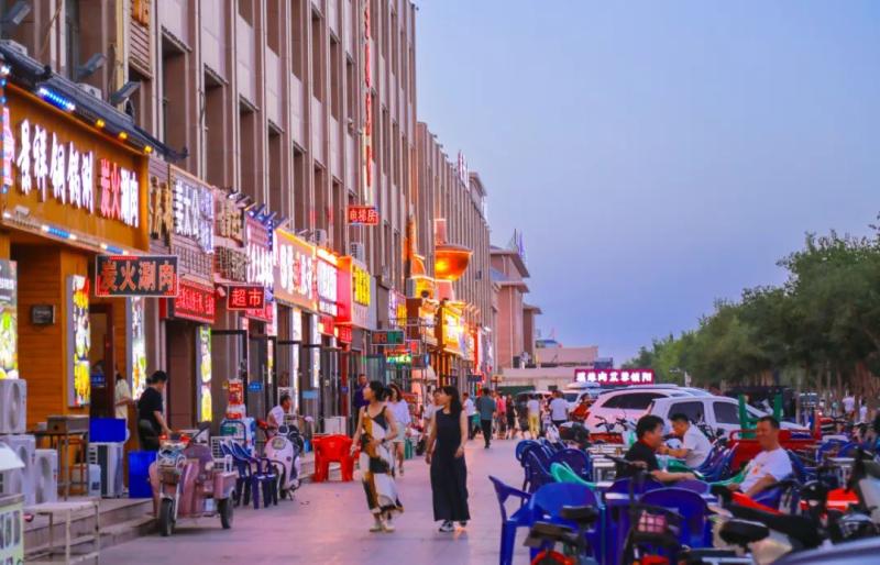走進達來呼布鎮(zhèn)各主要街道,濃濃的煙火氣撲面而來。不少餐廳門口支起熱鬧的夜市攤位,游客們圍坐在一起,品嘗駝肉、羊肉等當?shù)靥厣朗?,歡聲笑語不斷。