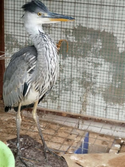 經有經驗的民警辨認,這是一只蒼鷺幼鳥。這只鳥身高約70公分,長長的尖嘴,身著灰色體羽,頭戴深灰色羽冠,兩條大長腿格外顯眼,白色的前頸縱向排列著黑灰色條紋。民警聯(lián)系獸醫(yī)為其做了體檢,經檢查,這只鳥并無傷病,可能是由于剛出窩飛行能力不強、捕食能力不足,造成體力虛弱。民警買來小魚,只見這只鳥狼吞虎咽享用起來,不久便精神十足,開始啄民警??吹剿w力開始恢復,民警懸著的心也就放下了。民警計劃選擇合適時間和地方將其放飛。