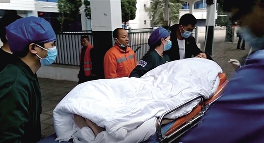 在江西信豐站臨時(shí)???jī)煞昼姡蠹覅f(xié)力將產(chǎn)婦和新生兒抬到120急救車上,送往醫(yī)院進(jìn)一步治療。(圖片由劉晶新提供)
