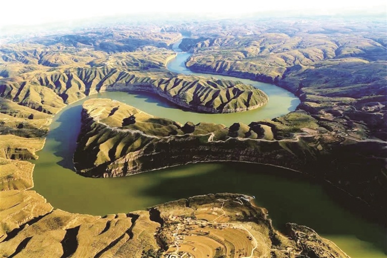 一瀉千里奔騰向前的黃河,在即將告別鄂爾多斯高原之際忽然變得戀戀不舍,繞著準格爾大峽谷迂回徘徊,留下了兩個接近360度的大轉(zhuǎn)彎。青山不墨,綠水無語,卻肩并肩勾勒出流傳千秋的畫卷——“太極灣”。
