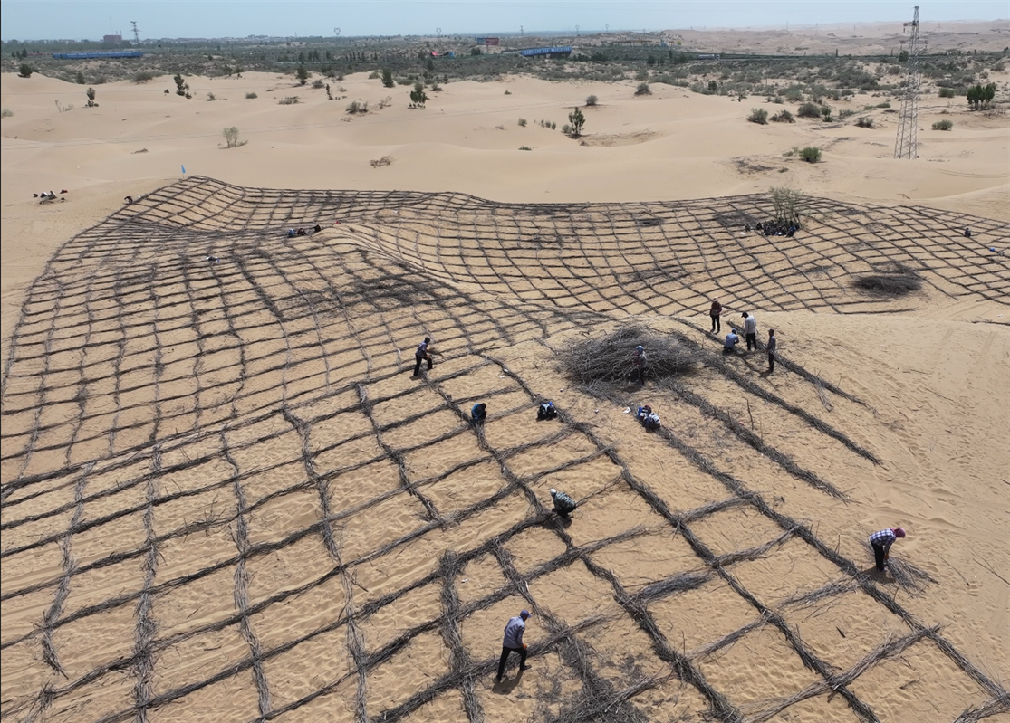 在鄂爾多斯市庫布其沙漠S215穿沙公路沙化土地綜合治理項目現(xiàn)場,工人正在固定沙障。(資料圖)