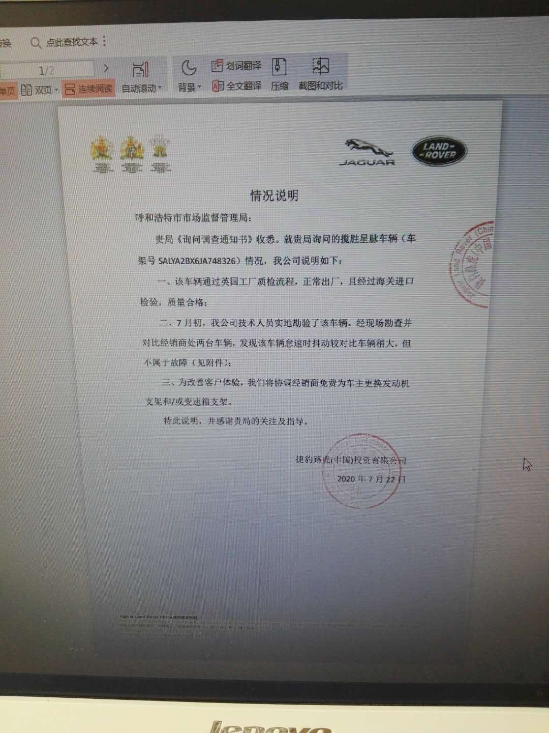 今年5月初,李女士將此事投訴到了呼和浩特市市場監(jiān)督管理局。經(jīng)執(zhí)法人員調(diào)查,李女士反映的情況屬實。隨后,在執(zhí)法人員的關(guān)注下,路虎總部還派人來查看該車輛,但是堅稱該車沒有質(zhì)量問題。此后,該局向路虎總部發(fā)出了《詢問調(diào)查通知書》。7月22日,捷豹路虎(中國)投資有限公司向該局回函稱:“1.該車通過英國工廠質(zhì)檢流程,正常出廠,而且經(jīng)過海關(guān)進(jìn)口檢驗,質(zhì)量合格。2.7月初,我公司技術(shù)人員實地勘驗了該車輛,經(jīng)現(xiàn)場勘察并且對比經(jīng)銷商(順馳路捷)處兩臺車輛,發(fā)現(xiàn)該車輛怠速時抖動較對比車輛稍大,但不屬于故障。3.為改善客戶體驗,我們將協(xié)調(diào)經(jīng)銷商免費為車主更換發(fā)動機支架和/或變速箱支架?!?/p>