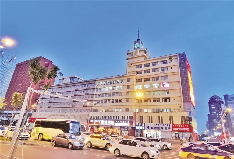 當(dāng)日傍晚時(shí)分,天色漸暗,華燈初上,在斑斕的霓虹燈中,街道車水馬龍,人群熙熙攘攘,一派繁華都市的景象。這座建于1983年的景觀塔鐘,依然和30多年前一樣屹立在新華廣場(chǎng)東側(cè)的信息大廈樓頂,再次以“地標(biāo)”姿態(tài)工作起來。