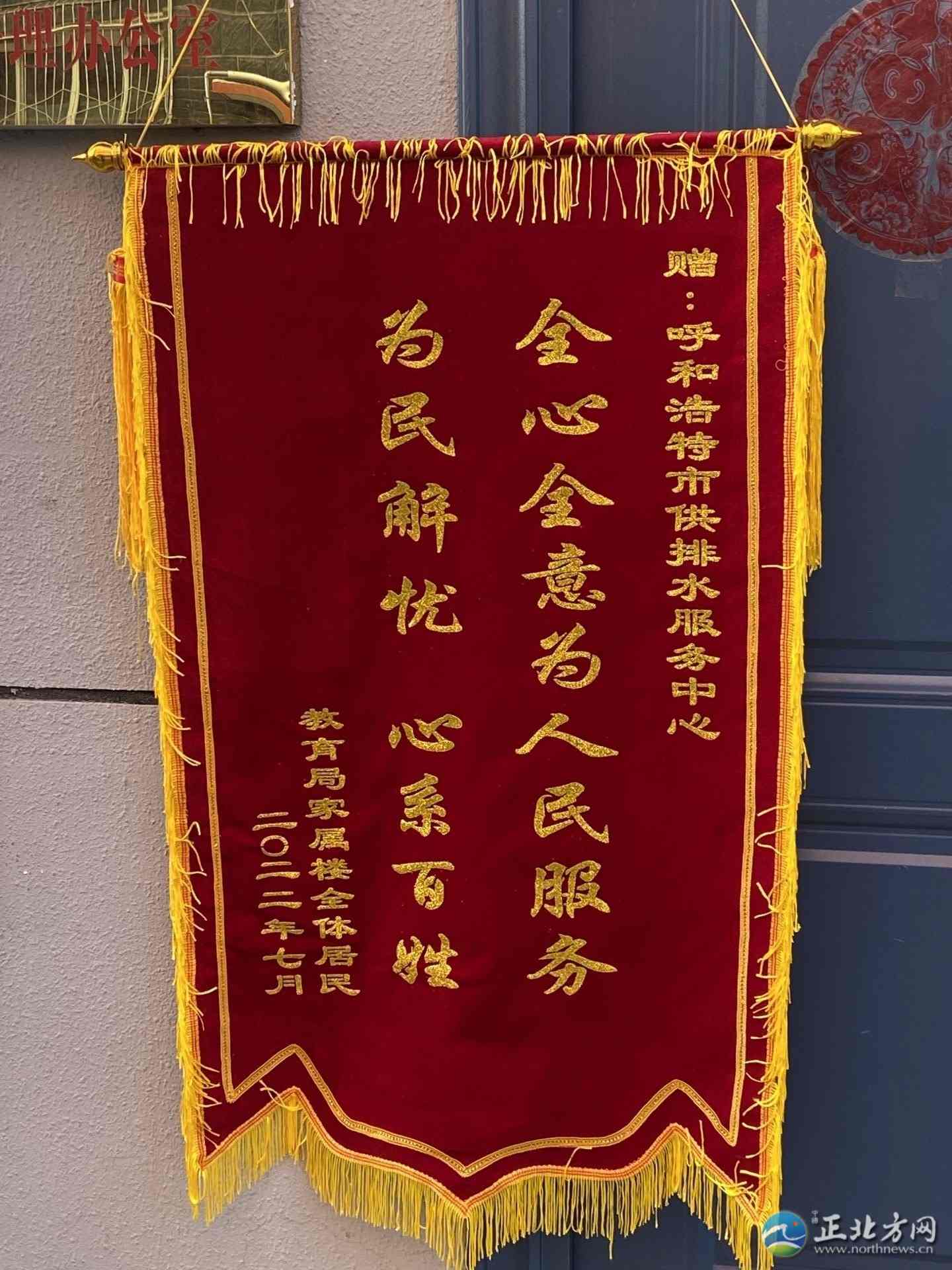 隨后,記者又來到新城區(qū)教育局宿舍樓,該小區(qū)已經(jīng)改造完畢,居民們已經(jīng)能正常用水了。為了表示感謝,小區(qū)全體居民特地制作了一面錦旗,派居民代表送到呼和浩特市供排水服務中心。