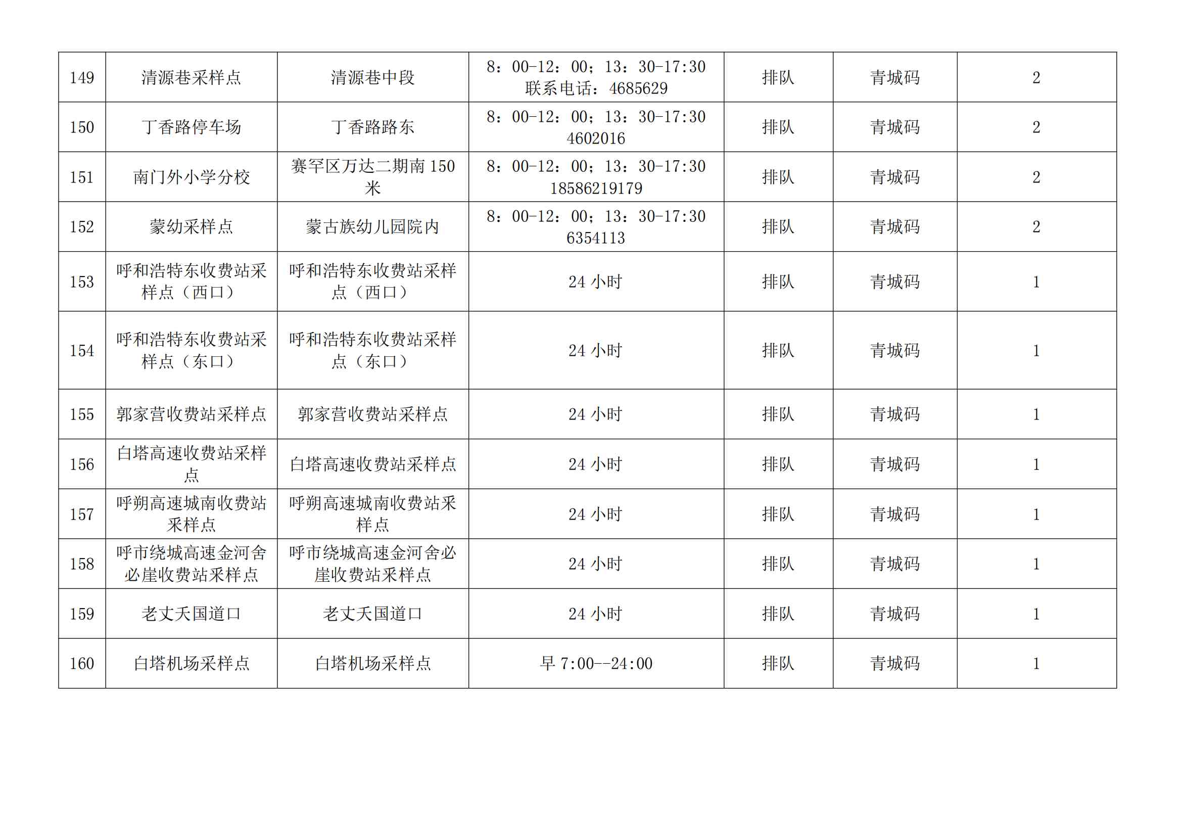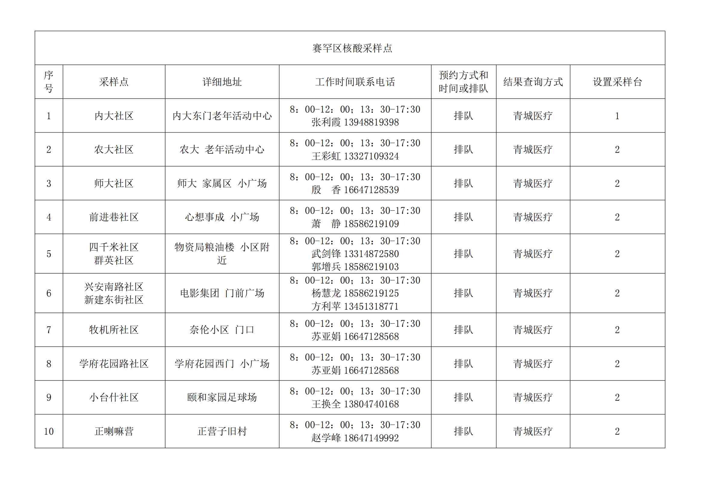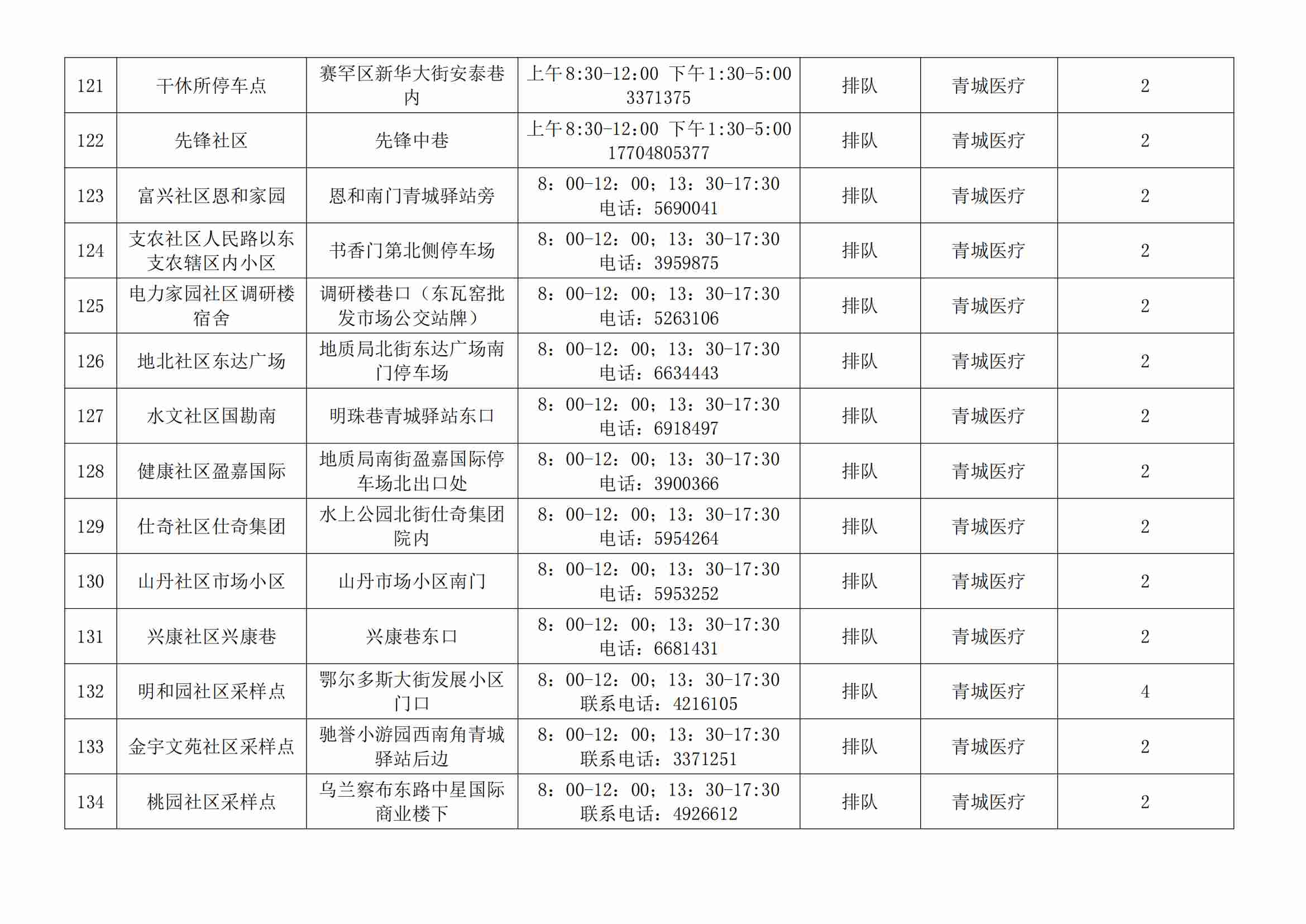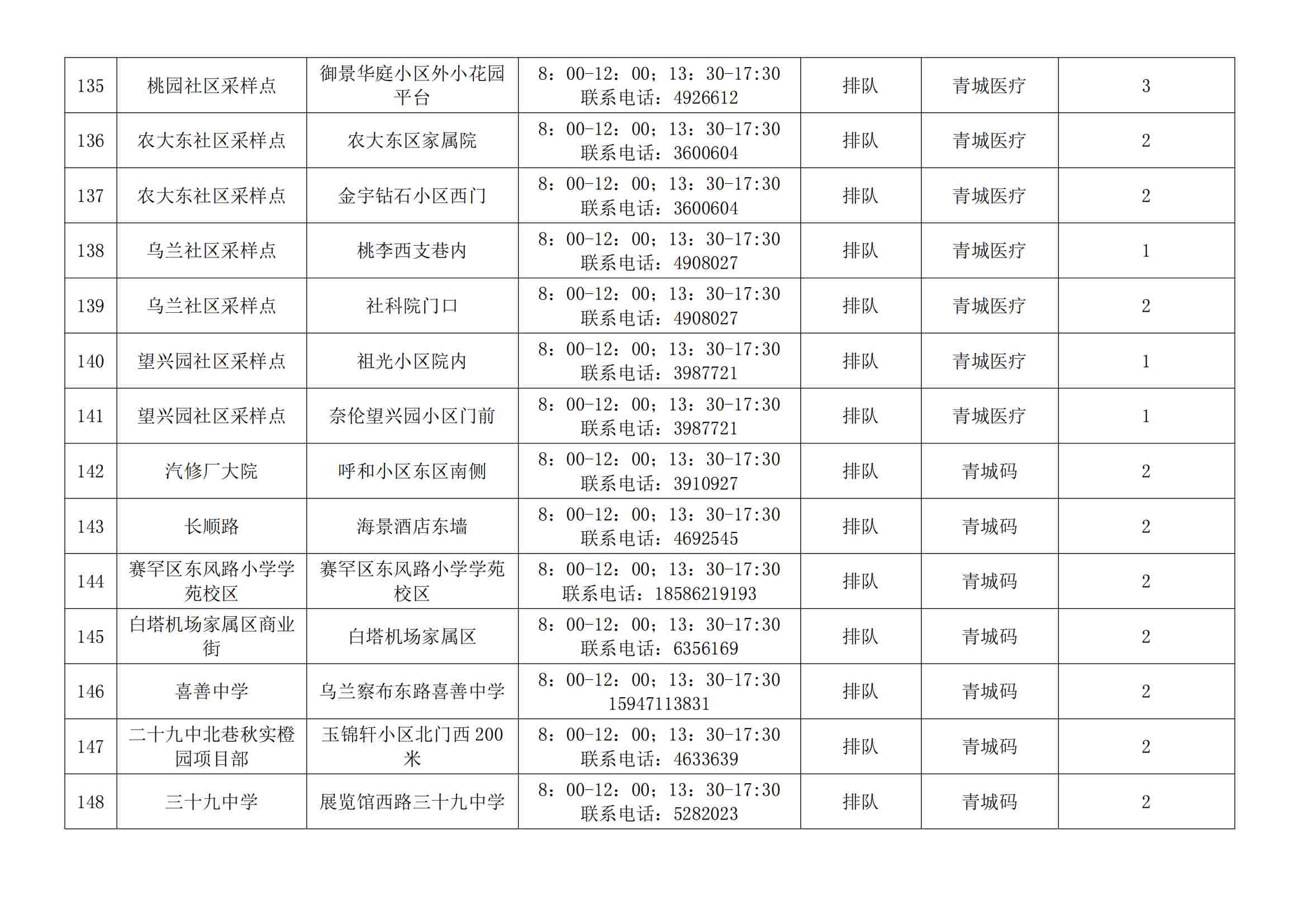 根據(jù)全市核酸檢測(cè)政策的調(diào)整,為滿(mǎn)足市民就醫(yī)、出行、工作等核酸檢測(cè)需求,賽罕區(qū)開(kāi)放160個(gè)便民核酸采樣點(diǎn)(詳見(jiàn)附表),廣大市民可就近選擇,核酸結(jié)果從青城碼查詢(xún)。