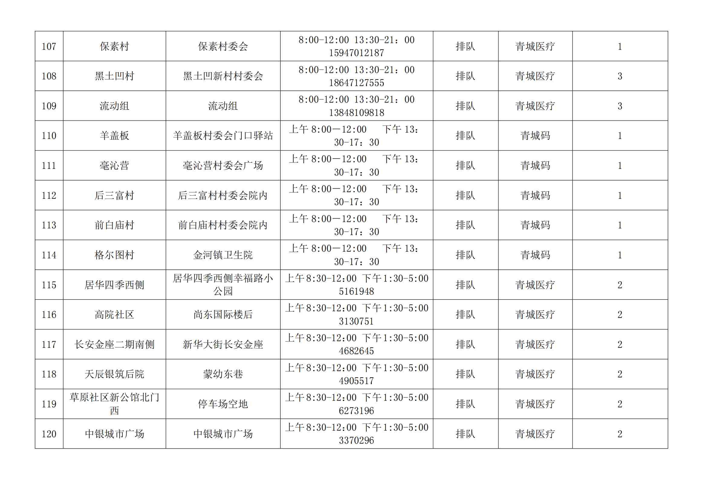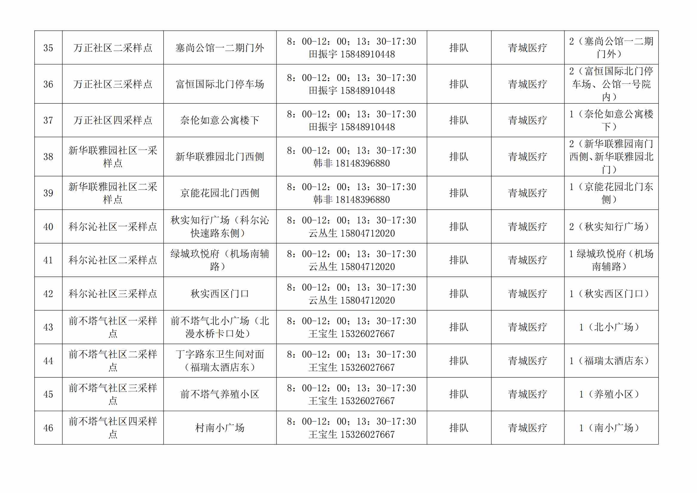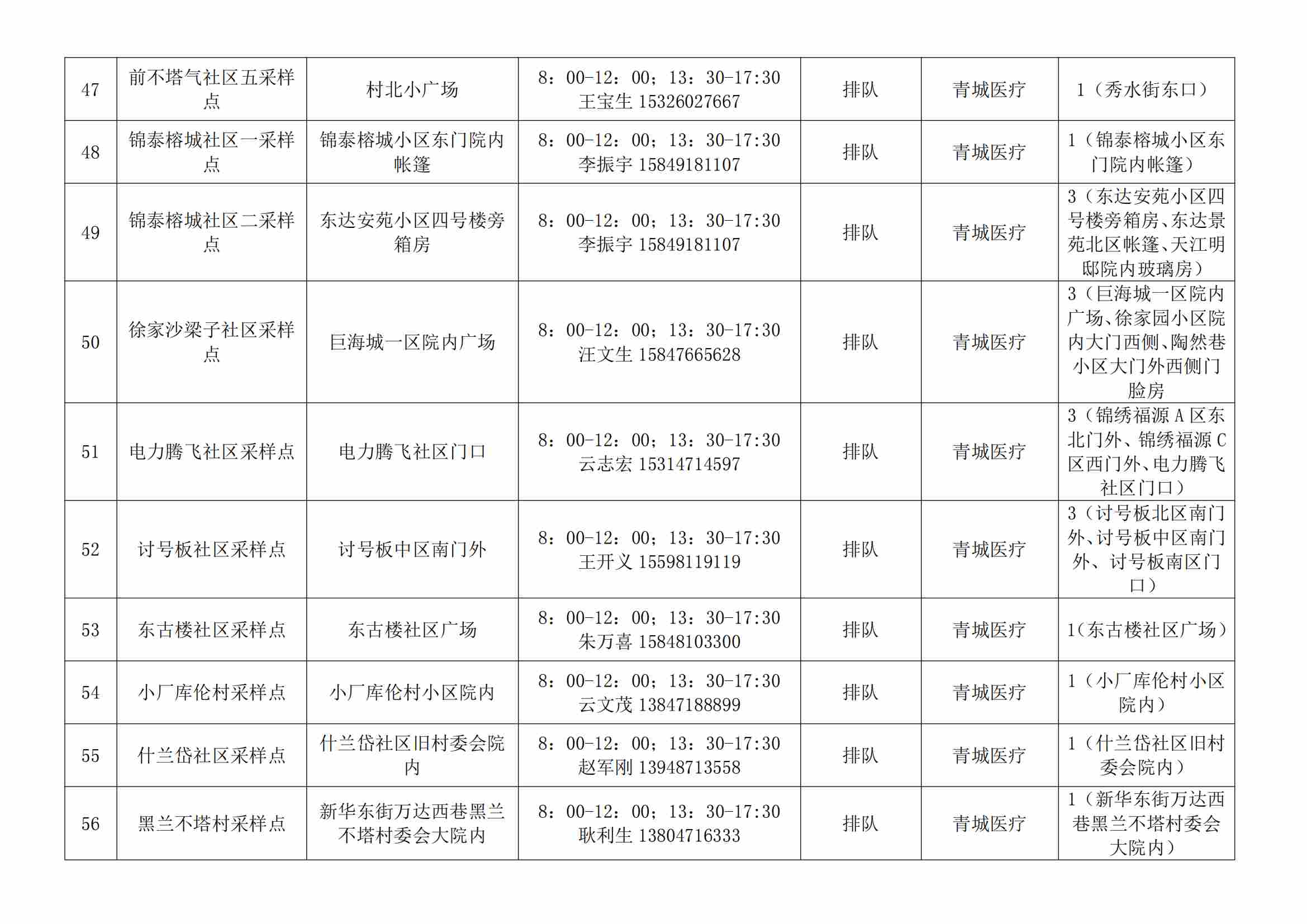 根據(jù)全市核酸檢測(cè)政策的調(diào)整,為滿(mǎn)足市民就醫(yī)、出行、工作等核酸檢測(cè)需求,賽罕區(qū)開(kāi)放160個(gè)便民核酸采樣點(diǎn)(詳見(jiàn)附表),廣大市民可就近選擇,核酸結(jié)果從青城碼查詢(xún)。