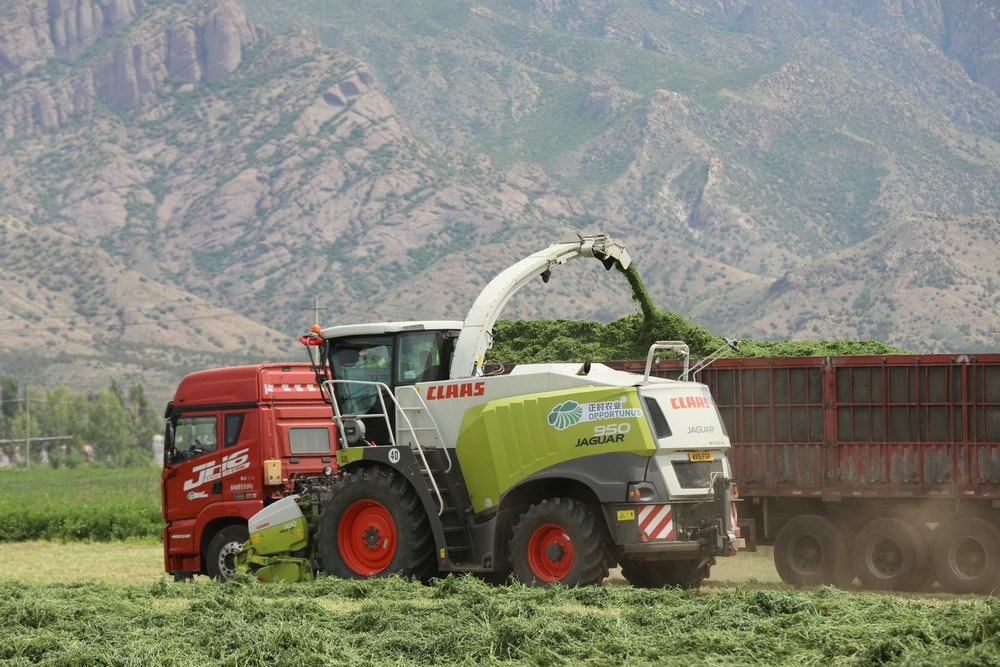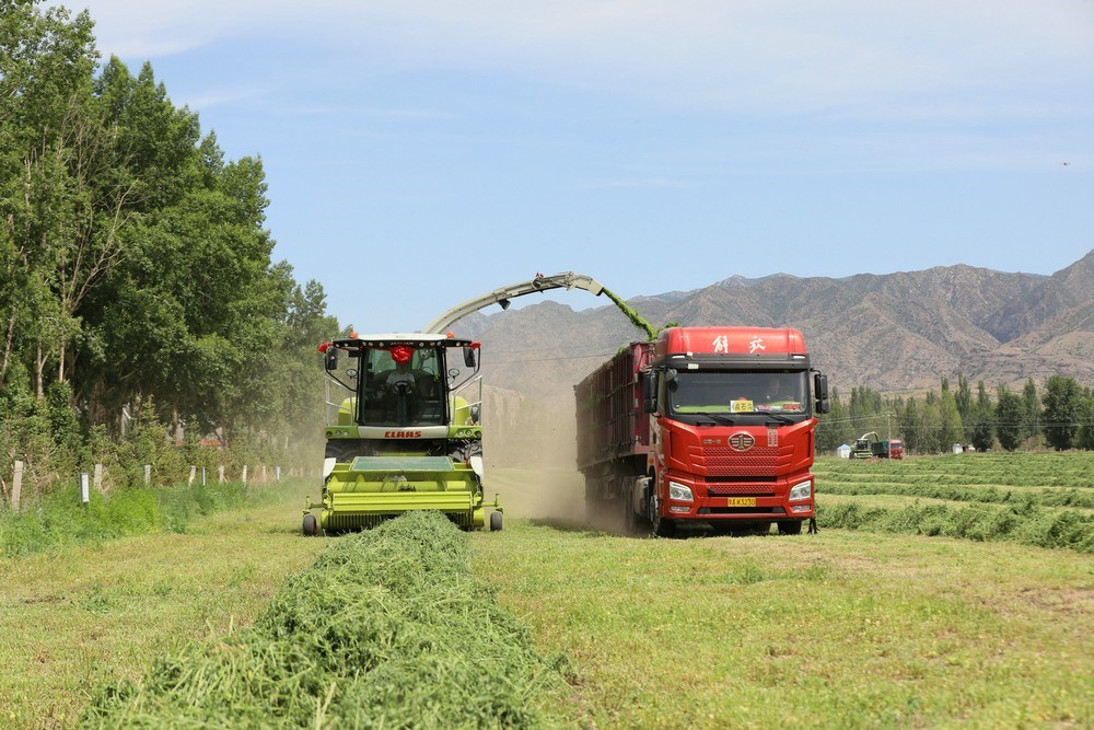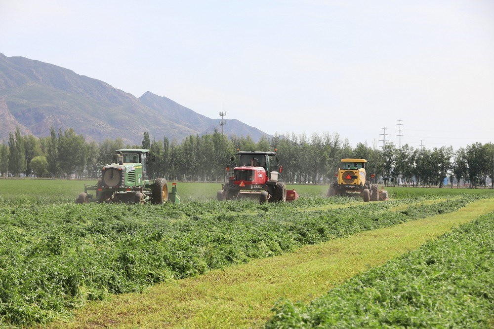 紫花苜蓿是多年生草本植物,因其產(chǎn)量高、生長周期短、再生能力強,是優(yōu)質(zhì)的高蛋白牧草。當(dāng)天,收割令一下,3臺大型收割機械同時開動,如同巨輪駛?cè)刖G色海洋,場面壯觀。割下的紫花苜蓿就地晾曬,待苜蓿中水分含量下降后,再進行粉碎、裹包,然后進行貯存,提供給牧場作為青貯飼料。