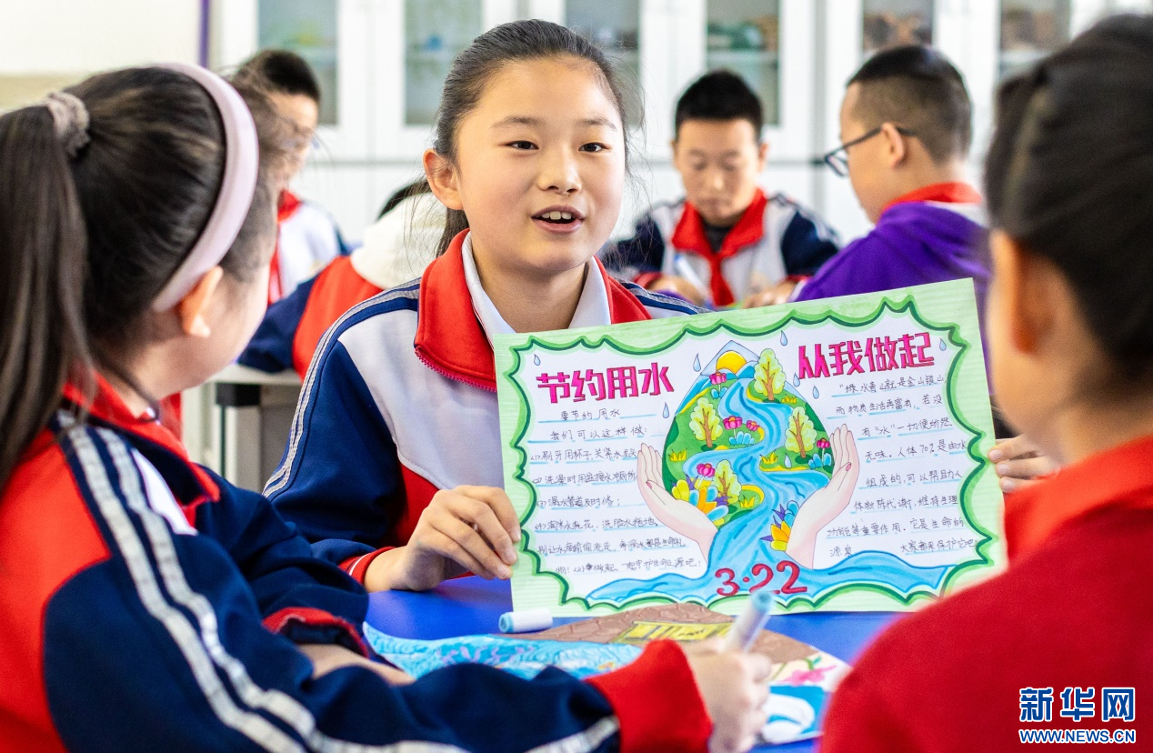 ??3月20日,呼和浩特市玉泉區(qū)石東路小學(xué)學(xué)生在班隊會上分享節(jié)水小妙招。新華網(wǎng)發(fā)(丁根厚 攝)