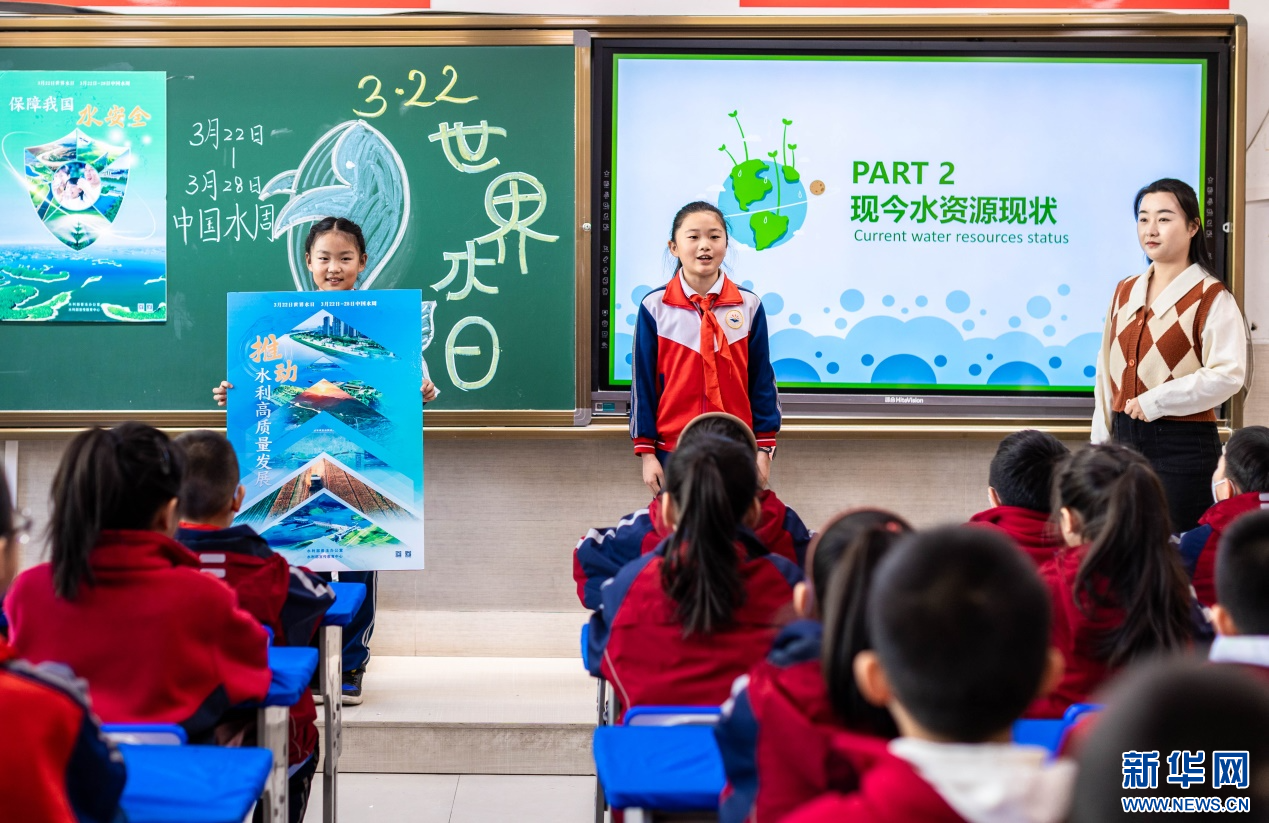 ??3月20日,呼和浩特市玉泉區(qū)石東路小學(xué)老師向?qū)W生們講解“保障我國水安全”等知識。新華網(wǎng)發(fā)(丁根厚 攝)