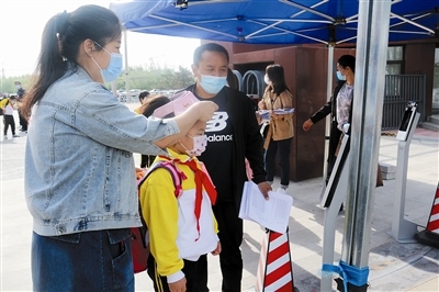 “等了這么久,終于可以和同學(xué)們說句:早上好。”6月2日,早上7點(diǎn)剛過,通遼新城第一中學(xué)小學(xué)部二年一班的班主任崔老師早早的在校門口,迎接班里的小朋友們。記者在校門口看到,此時(shí),小學(xué)部二、三年級(jí)的小朋友已經(jīng)陸續(xù)入校了,顯然,“萌娃”們已經(jīng)被校門口的層層關(guān)卡震撼到了,幸好,在眾多老師的幫助和指引下順利進(jìn)入了校門。進(jìn)入了校門后,還有一道重要關(guān)卡,測(cè)量體溫,習(xí)慣了伸出手臂來測(cè)量體溫的“萌娃”們,對(duì)著紅外線測(cè)溫儀卻不知所措了,有的對(duì)著測(cè)溫儀伸出了手臂、有的對(duì)著測(cè)溫儀行禮,著實(shí)“萌”翻了現(xiàn)場(chǎng)所有人?!按蘩蠋?,我們都想你了?!币姷綆孜恍∨笥岩獪惖礁皟?,崔老師立刻提醒同學(xué)們:我也很想念你們,但是我們要保持“一米”的距離,快去教室吧!小朋友們被“殘忍”拒絕,很是失落。