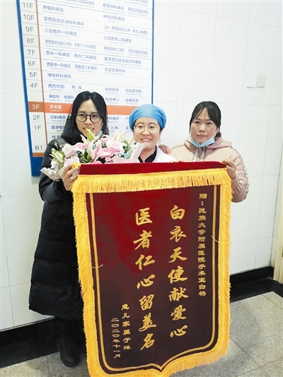 11月27日,當(dāng)孩子已經(jīng)好轉(zhuǎn)出院,王欣影沒(méi)有忘記那一夜遇到的好心人,她再一次撥通白楊的電話,此時(shí),她才得知白楊就是附屬醫(yī)院手術(shù)室的一名護(hù)士。她將一面寫有“白衣天使獻(xiàn)愛(ài)心醫(yī)者仁心留美名”的錦旗送到了白楊的手中,她說(shuō):女兒又多了一位媽媽。白楊也向記者講起了那晚的經(jīng)歷,她說(shuō):“其實(shí),那晚我是去接我丈夫的,由于暴雪,丈夫被困在了米家科技園附近,我開車去接他,在回來(lái)的路上,看到有車輛遇險(xiǎn),心想,這樣惡劣的天氣,遇到誰(shuí)有困難就應(yīng)該幫一把,當(dāng)時(shí),我們也沒(méi)有多想,我也是做母親的,看到夫妻倆那么焦急,我只想把孩子快點(diǎn)送到醫(yī)院,好在有驚無(wú)險(xiǎn),孩子平安無(wú)事?!焙髞?lái),記者還了解到,當(dāng)把孩子送到醫(yī)院后,白楊已渾身濕透,待孩子已經(jīng)搶救上,安頓好王欣影后,已經(jīng)是凌晨5點(diǎn),天也蒙蒙亮了,白楊沒(méi)有回家,一夜未眠的她,留在了工作崗位上。