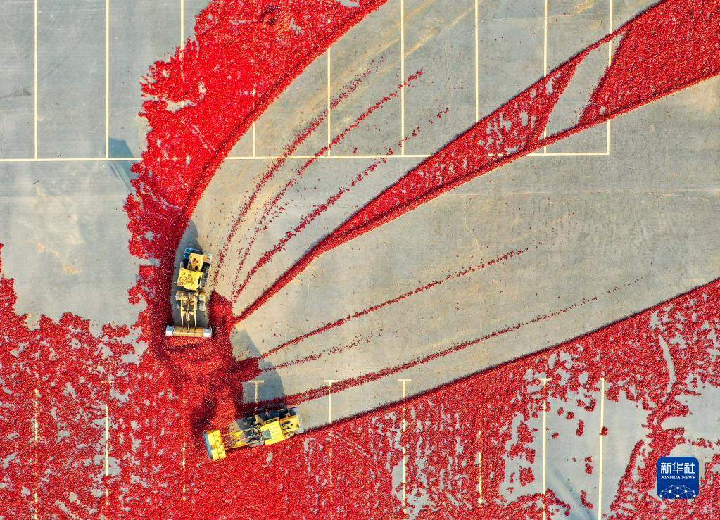 10月25日,在開魯縣東風(fēng)鎮(zhèn),工作人員駕駛鏟車收獲晾曬好的紅干椒(無人機照片)。新華社記者 連振 攝
