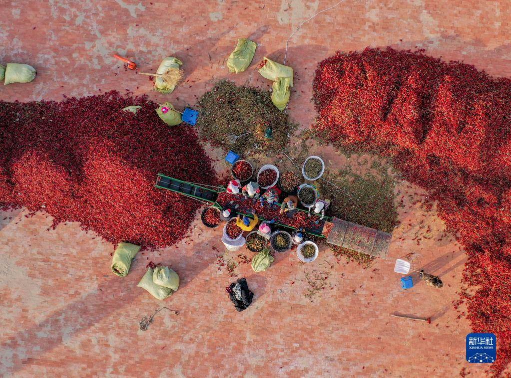 10月25日,在開魯縣東風(fēng)鎮(zhèn)東方紅村,工作人員分揀處理紅干椒(無人機照片)。新華社記者 連振 攝