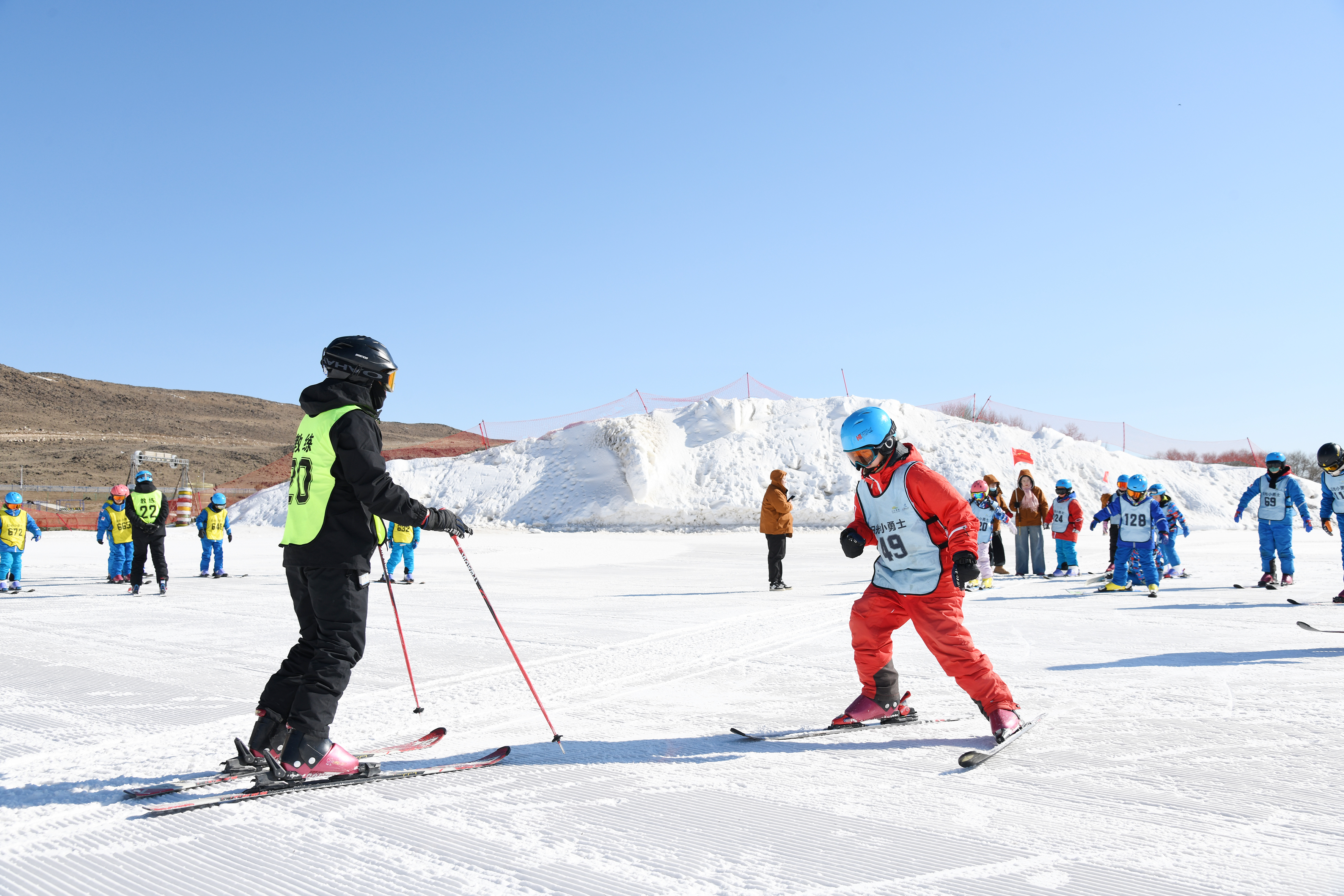 “把腳尖對(duì)準(zhǔn)雪板凹槽,腳后跟用力下踩?!薄半p腿呈‘V’字形,與肩同寬,掌握好平衡。”冬令營(yíng)學(xué)員在烏蘭察布日光火山大河灣滑雪度假區(qū)專業(yè)教練的悉心指導(dǎo)下,從最基礎(chǔ)的穿戴裝備學(xué)起,逐漸掌握了犁式轉(zhuǎn)彎、半犁式轉(zhuǎn)彎等技巧。經(jīng)過(guò)一個(gè)多小時(shí)的學(xué)習(xí)和鍛煉,有一定基礎(chǔ)的學(xué)員已經(jīng)可以在雪道上腳踏雪板飛馳而下,并流暢地完成大回轉(zhuǎn)等動(dòng)作;有的學(xué)員偶爾摔倒,也會(huì)迅速起身繼續(xù)訓(xùn)練。
