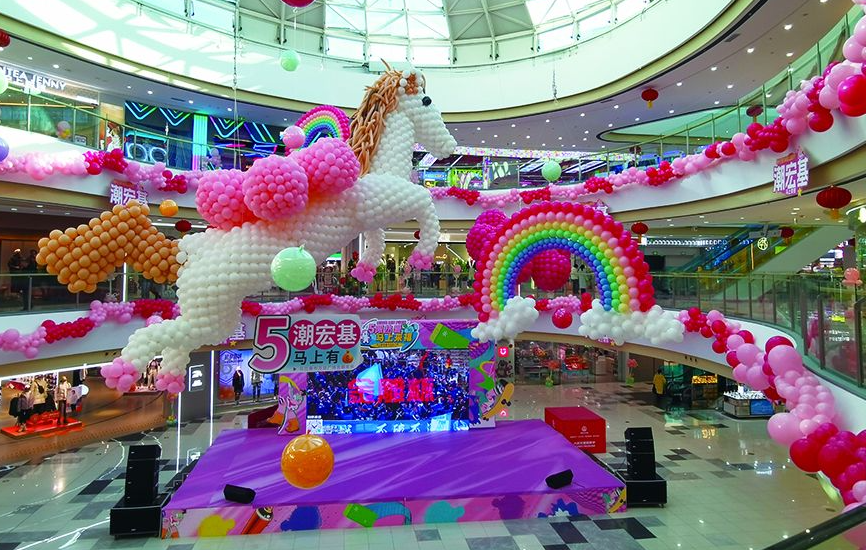 走進(jìn)集寧區(qū)萬達(dá)廣場,一樓東門的跨年倒計(jì)時(shí)展板格外醒目,“約定,今年要和我愛的人一起跨年”的字樣搭配喜慶的紅色背景,將跨年的儀式感拉滿。商場內(nèi)部的布置巧思盡顯,中庭位置,巨型氣球打造的白色小馬造型栩栩如生,粉色、橙色氣球簇?fù)碜笥遥慌缘牟屎鐨馇蜓b飾蜿蜒舒展,與各品牌門前統(tǒng)一的彩色氣球相映成趣,簡約的裝飾搭配讓節(jié)日氛圍愈發(fā)濃郁。