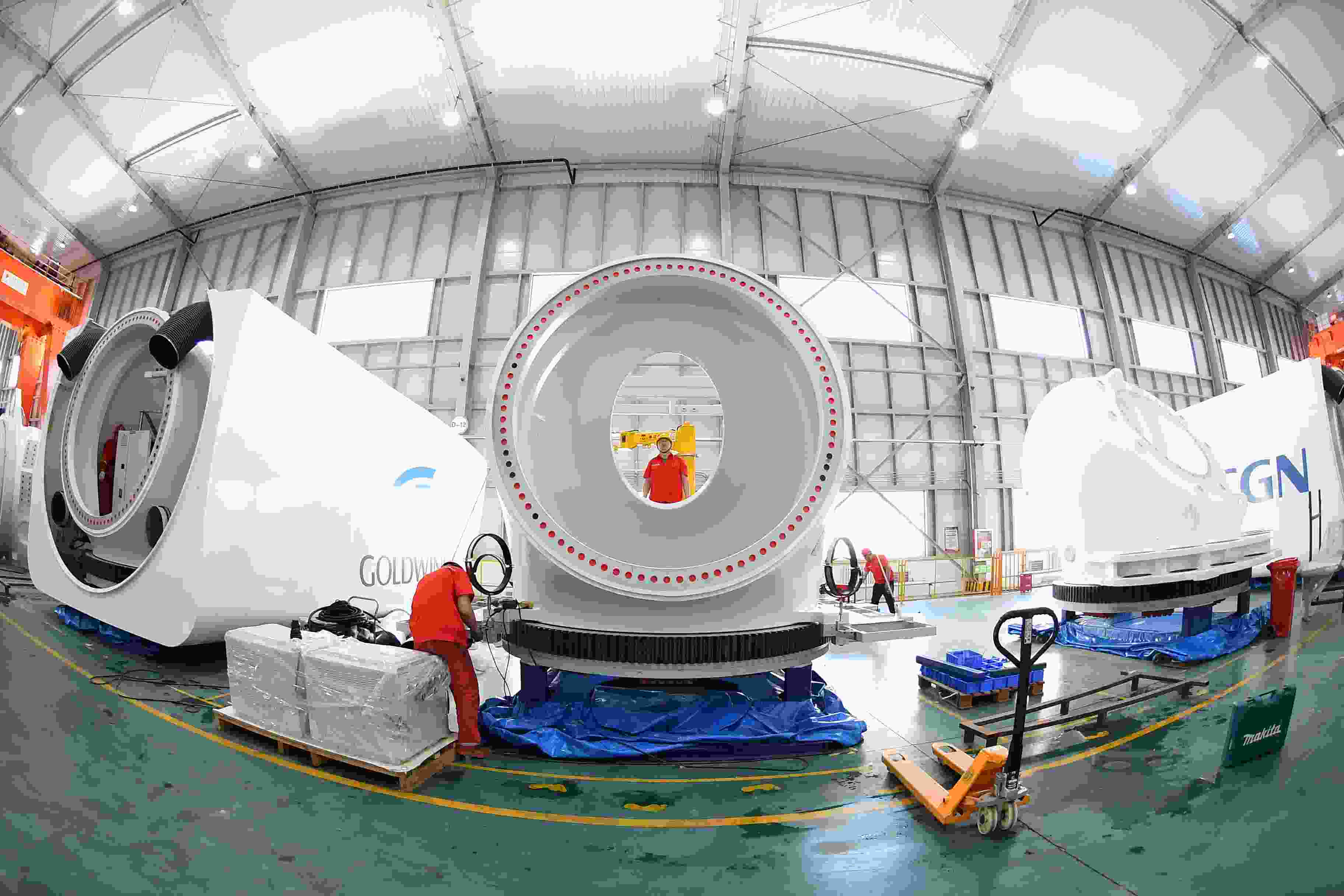 金風(fēng)科技公司工人在安裝風(fēng)機(jī)主機(jī)。邱金鵬攝