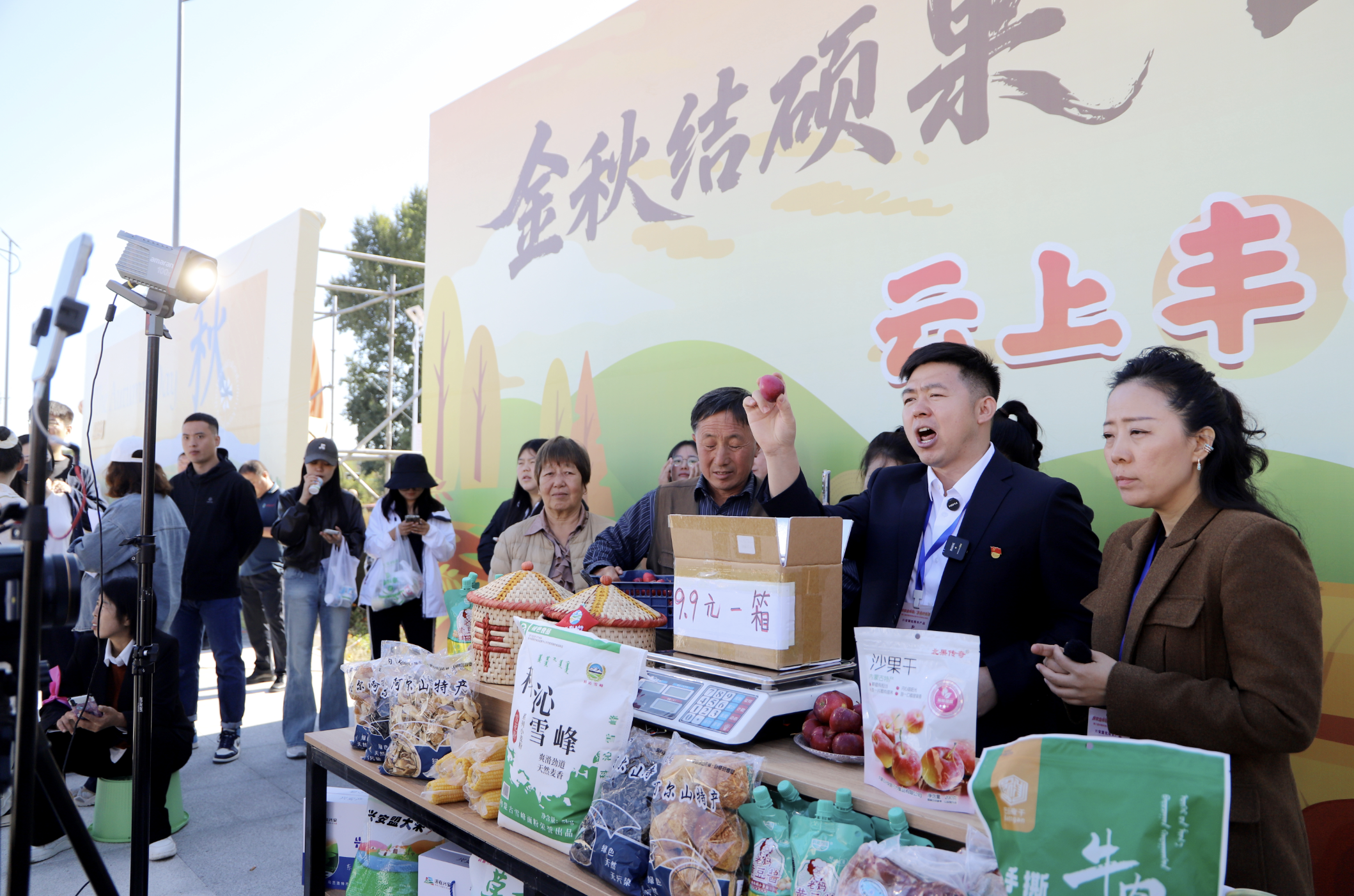 “這都是我們本地的農(nóng)產(chǎn)品,我現(xiàn)在正在豐收節(jié)的現(xiàn)場,各位朋友抓緊下單,興安盟產(chǎn)品不會(huì)讓你失望!”活動(dòng)現(xiàn)場,烏蘭浩特市義勒力特鎮(zhèn)西包達(dá)力干嘎查駐村干部王曉龍將直播間設(shè)在現(xiàn)場,與村民在豐收的熱情氛圍中一起賣力地推介家鄉(xiāng)好物。