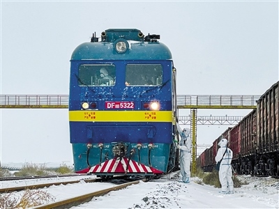 11月6日,二連出入境邊防檢查站執(zhí)勤民警頂風(fēng)冒雪,對通關(guān)列車進(jìn)行檢查驗放。日前,二連浩特市出現(xiàn)降雪、強降溫天氣,最低溫度降至零下15℃。二連出入境邊防檢查站民警積極做好惡劣天氣下疫情防控、通關(guān)服務(wù)保障工作,全力保障口岸通關(guān)安全順暢。(記者 安寅東 攝)