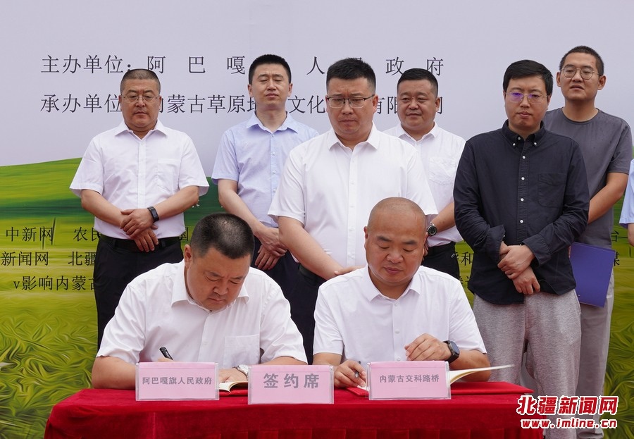 推介會現(xiàn)場,阿巴嘎旗人民政府副旗長李軍分別與內(nèi)蒙古交科路橋建設(shè)有限公司黨委書記、董事長鈕英才,內(nèi)蒙古草原地圖文化傳播有限公司負責人王國柱簽訂戰(zhàn)略合作協(xié)議。