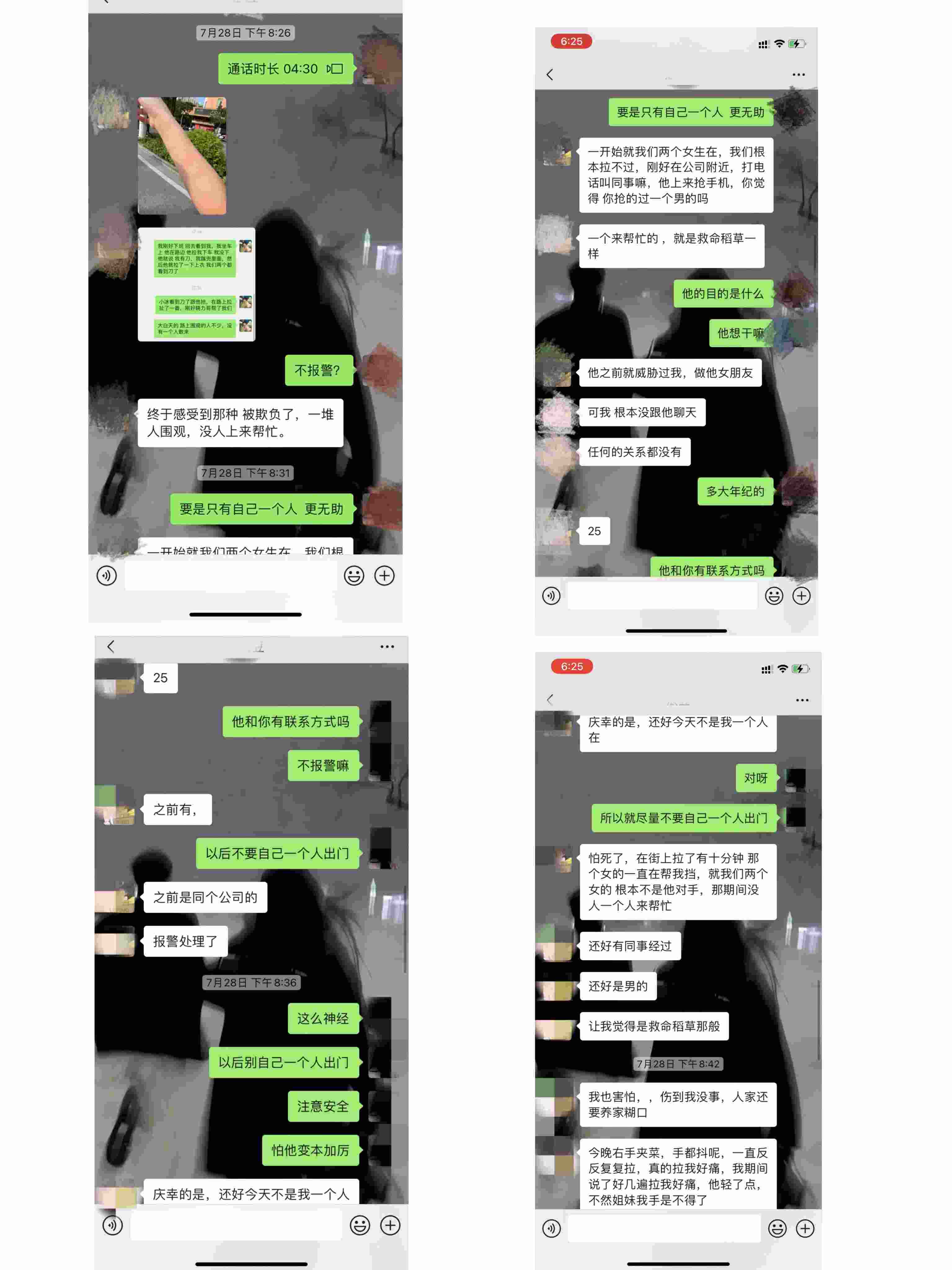 相關(guān)聊天截圖顯示,此次被黃某南威脅后,陳某萍和朋友在微信聊天時表示,“報警處理了”。陳某萍還表示,當時,黃某南拉她上衣時,她看到了刀,感到非常害怕,幸好有同事出手相助?!八熬屯{過我,做他女朋友。可我根本沒跟他聊天,任何關(guān)系都沒有。”