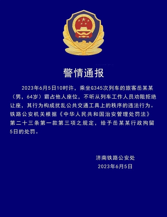·64歲男子高鐵上霸占他人座位拒讓座,被行拘5日。