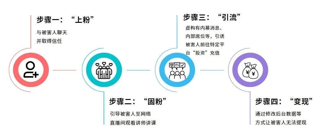 接下來,講師會通過虛構有內幕消息、內部席位等情節(jié),將被害人“引流”至團伙自制的“長盛資本”“瑞達資產”“匯利資產”等平臺“投資”充值,后把握時機,通過修改后臺數(shù)據(jù)等方式讓被害人無法提現(xiàn),卻成為他們的“變現(xiàn)”時刻。至案發(fā)時,該團伙已詐騙多名被害人,犯罪金額共計人民幣500余萬元。