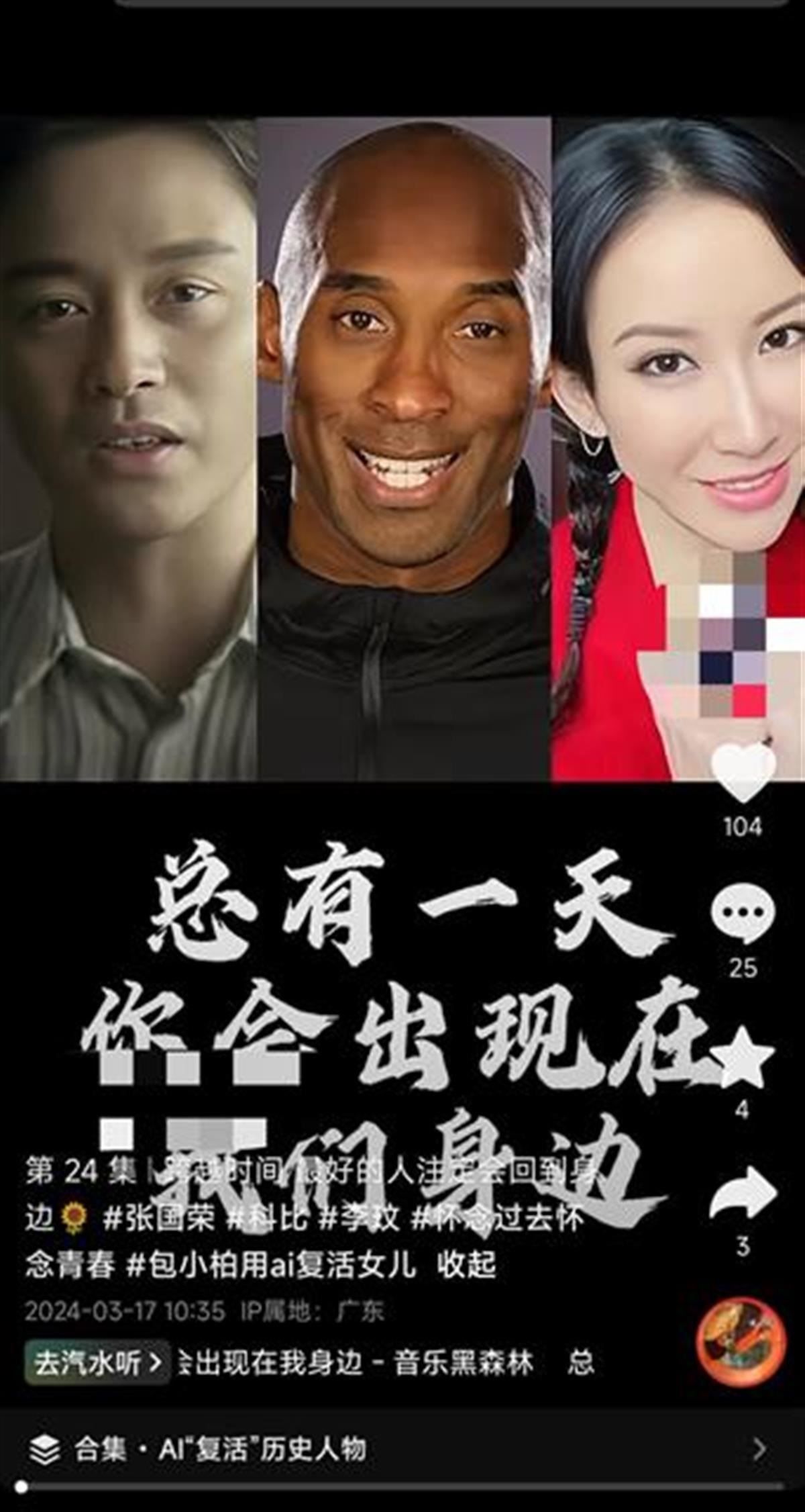 在社交平臺,類似的“AI復(fù)活師”賬號仍在活躍。這些賬號通過發(fā)布科比、李玟、張國榮等已逝名人的AI視頻吸引觀眾,并在簡介中聲稱可以通過AI技術(shù)定制數(shù)字人、克隆聲音、修復(fù)照片,還能“復(fù)活”已逝親人,定制他們的音頻視頻。目前,部分“AI復(fù)活師”的視頻已被平臺標注“內(nèi)容疑似AI生成,請謹慎甄別”。