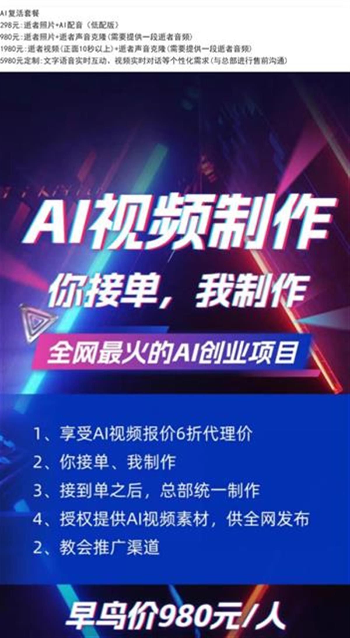 記者私信其中一名“AI復(fù)活師”詢問能否制作已逝明星的定制說話視頻,對方表示可以,且有多種模式可供選擇,需要添加微信了解詳情。對方提供的“AI復(fù)活套餐”包括“逝者照片+AI配音”“逝者照片+逝者聲音克隆”“逝者視頻+逝者聲音克隆”等服務(wù),價格從298元到1980元不等。除AI視頻服務(wù)外,這名“AI復(fù)活師”還表示正在收徒及尋找下游代理,可提供AI視頻制作教學(xué)服務(wù)。