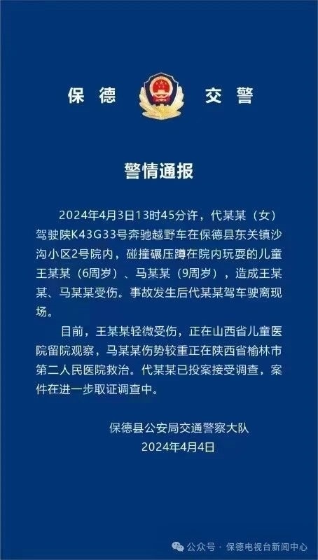 央視網(wǎng)消息:據(jù)保德縣融媒體中心消息,4月4日,保德縣公安局交通警察大隊發(fā)布警情通報:2024年4月3日13時45分許,代某某(女)駕駛陜K43G33號奔馳越野車在保德縣東關鎮(zhèn)沙溝小區(qū)2號院內,碰撞碾壓蹲在院內玩耍的兒童王某某(6周歲)、馬某某(9周歲),造成王某某、馬某某受傷。事故發(fā)生后代某某駕車駛離現(xiàn)場。