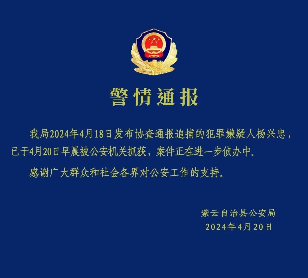 央視網(wǎng)消息:據(jù)“紫云公安”官微消息,紫云自治縣公安局4月18日發(fā)布協(xié)查通報追捕的犯罪嫌疑人楊興忠,已于4月20日早晨被公安機關(guān)抓獲,案件正在進(jìn)一步偵辦中。