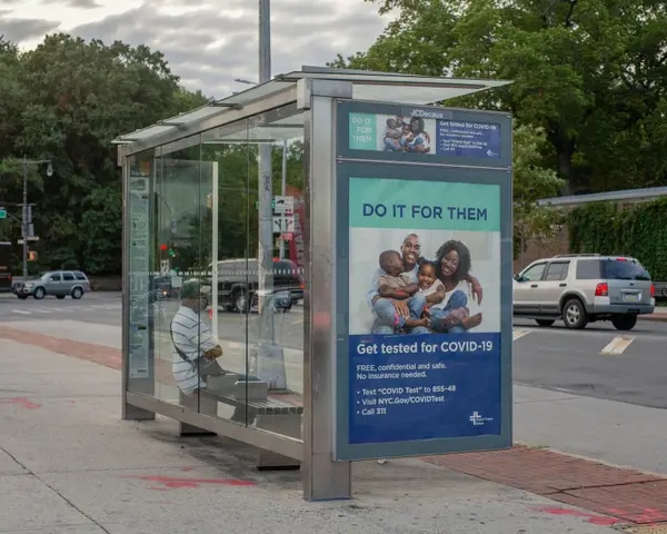 △美國紐約布魯克林一個公交車站的免費(fèi)核酸檢測廣告 (圖片來源:《紐約時報》)
