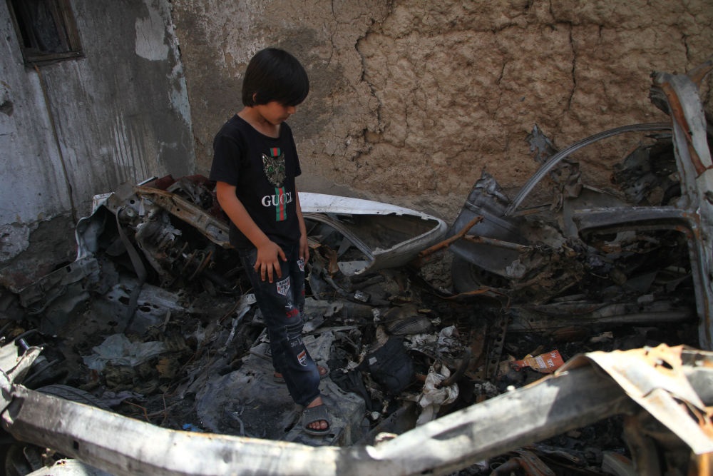 9月18日,在8月29日被美軍無人機襲擊的阿富汗喀布爾居民區(qū),遇難者親人站在汽車殘骸上。新華社發(fā)(塞夫拉赫曼·薩菲攝)