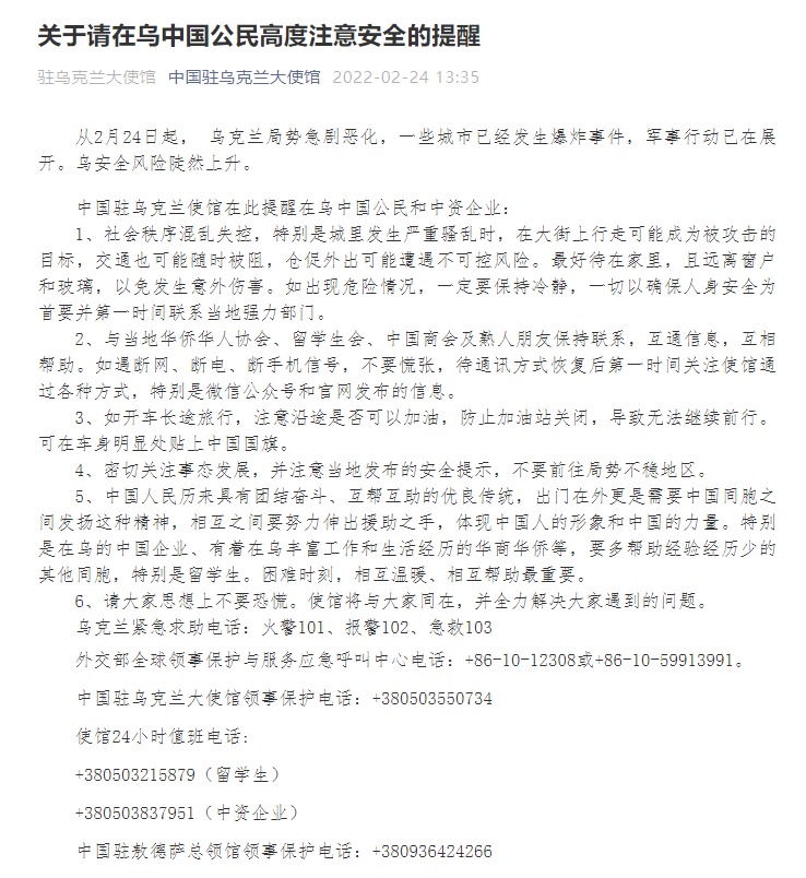 從2月24日起,烏克蘭局勢(shì)急劇惡化,一些城市已經(jīng)發(fā)生爆炸事件,軍事行動(dòng)已在展開。烏安全風(fēng)險(xiǎn)陡然上升。