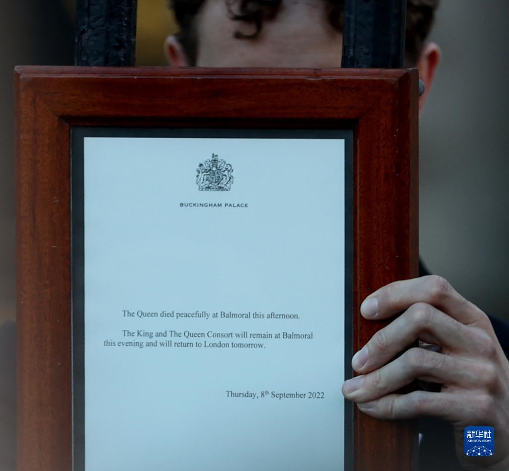 9月8日,在英國(guó)倫敦,工作人員將英國(guó)女王伊麗莎白二世去世的告示安放在白金漢宮大門上。新華社記者李穎攝