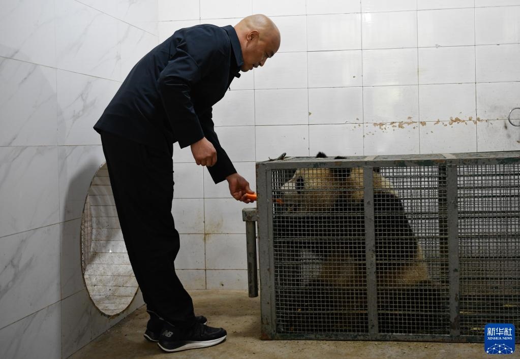 10月18日,在中國大熊貓保護研究中心雅安基地,飼養(yǎng)師董禮用胡蘿卜安撫進入轉(zhuǎn)運籠的大熊貓“四?!?。新華社記者 胥冰潔 攝