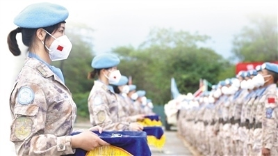 2022年9月30日,中國第八批赴南蘇丹(朱巴)維和步兵營700名維和官兵被聯(lián)合國授予“和平榮譽(yù)勛章”,以表彰他們在執(zhí)行維和任務(wù)期間的卓越表現(xiàn)和為南蘇丹和平事業(yè)作出的突出貢獻(xiàn)。圖為授勛儀式現(xiàn)場。 孫雪松攝(新華社發(fā))