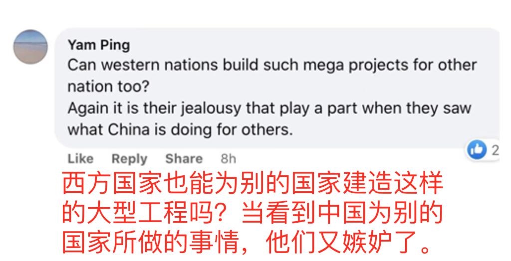 網(wǎng)友亞姆·平說:“西方國家也能為別的國家建造這樣的大型工程嗎?當(dāng)看到中國為別的國家所做的事情,他們又嫉妒了?!?/p>