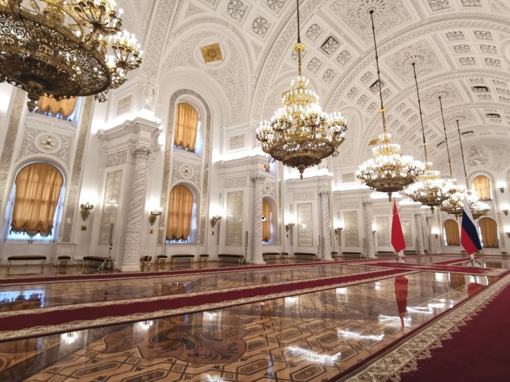 普京在喬治大廳為習(xí)近平舉行隆重歡迎儀式。