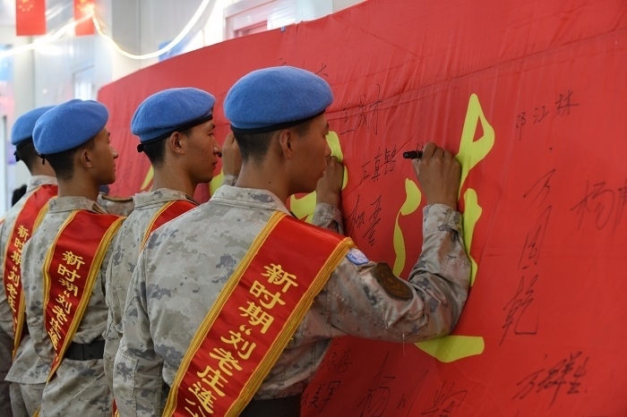 “劉老莊連”新評(píng)選的勇士在“勇士旗”上簽名。中國(guó)第九批赴南蘇丹(朱巴)維和步兵營(yíng)供圖