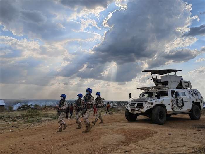 2022年12月,“劉老莊連”隨中國(guó)第九批赴南蘇丹(朱巴)維和步兵營(yíng)奔赴維和戰(zhàn)場(chǎng),重點(diǎn)擔(dān)負(fù)警戒巡邏、武裝護(hù)衛(wèi)、隔離沖突等維和任務(wù)。截至目前,“劉老莊連”累計(jì)行程1500余公里,高標(biāo)準(zhǔn)完成了各項(xiàng)授權(quán)任務(wù),受到聯(lián)南蘇團(tuán)各級(jí)高度贊揚(yáng)。這也是英雄的“劉老莊連”戰(zhàn)旗第一次飄揚(yáng)在非洲大地。