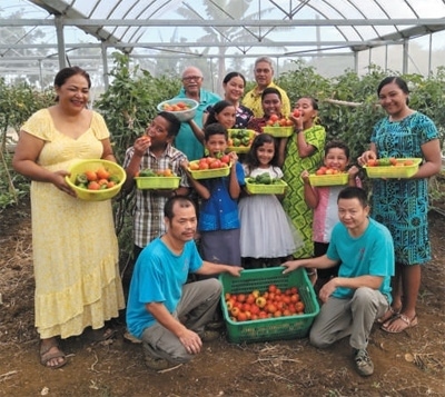 湯加農(nóng)戶拉姆齊一家和中方技術(shù)人員一起展示大棚里采摘的蔬菜。本報(bào)記者 陳效衛(wèi)攝