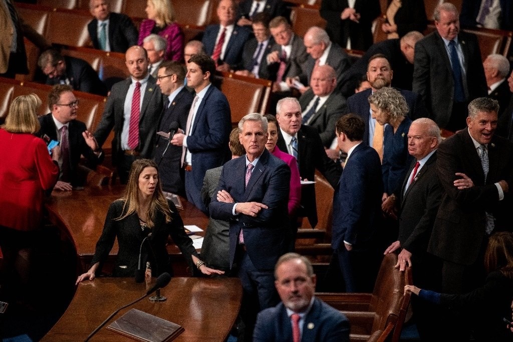 這是1月6日在美國(guó)華盛頓國(guó)會(huì)拍攝的凱文·麥卡錫(中)。經(jīng)過(guò)黨內(nèi)激烈爭(zhēng)論達(dá)成利益交換,共和黨眾議員凱文·麥卡錫于7日凌晨在第15輪眾議院議長(zhǎng)選舉表決中當(dāng)選議長(zhǎng)。(新華社記者劉杰攝)