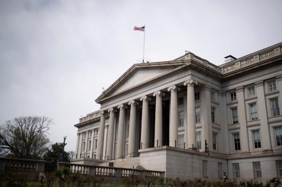 這是2020年3月27日在美國(guó)首都華盛頓拍攝的美國(guó)財(cái)政部大樓。(新華社記者劉杰攝)