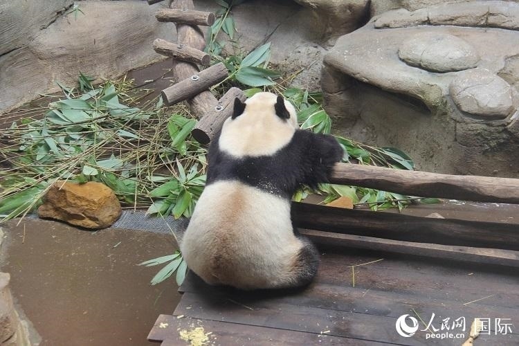 記者趕到時(shí),離開爸爸媽媽單獨(dú)生活的“圓夢(mèng)”正躺在木床上呼呼大睡,四仰八叉的可愛模樣吸引游客們紛紛駐足,拍照留念。動(dòng)物園工作人員介紹說(shuō),“圓夢(mèng)”現(xiàn)在已經(jīng)五歲多了,體重超過(guò)100公斤,身高也同成年大熊貓無(wú)差,活潑好動(dòng)、元?dú)鉂M滿。隨著飼養(yǎng)員往園內(nèi)投入新鮮的竹子,“圓夢(mèng)”也慢慢醒過(guò)來(lái),開始享用竹子大餐?!拔铱梢砸徽煸谶@里看它吃飯!真的太可愛了!這是我在動(dòng)物園最喜歡的動(dòng)物!”今年8歲的梅麗莎興奮地說(shuō)。