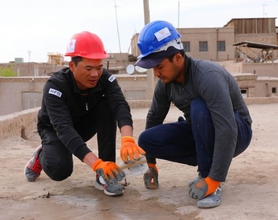 在烏茲別克斯坦希瓦古城哈桑·穆拉德庫什別吉清真寺,中方文物修復人員指導烏方工作人員修復清真寺屋頂。