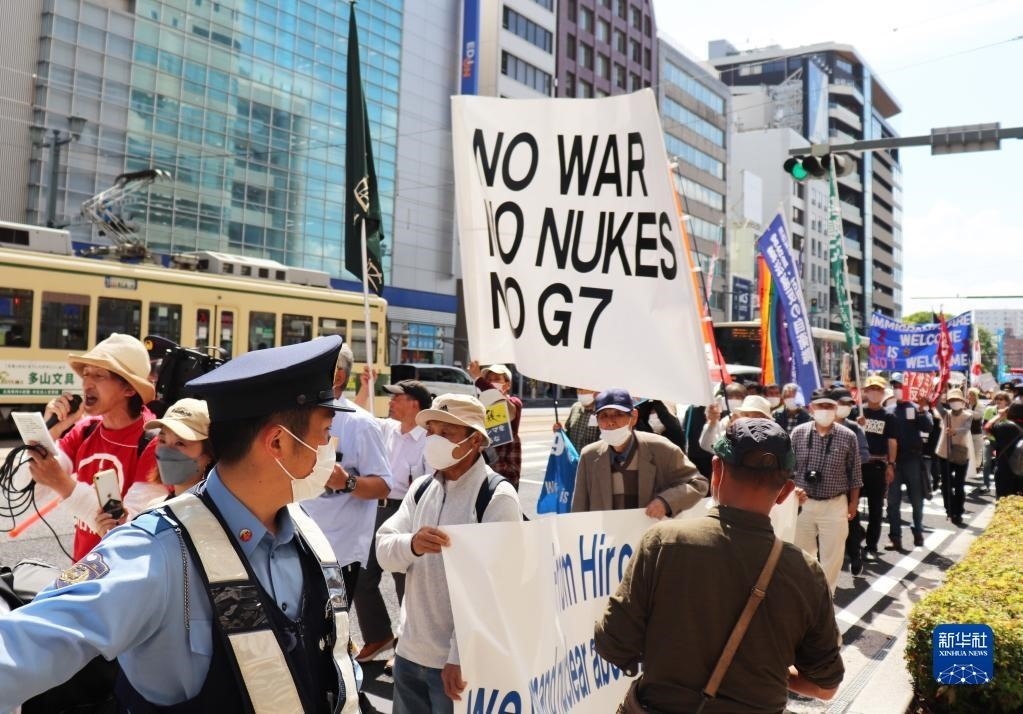 “不做戰(zhàn)爭(zhēng)幫兇”“不要G7”……14日,200多名日本民眾舉著各式標(biāo)語,在廣島和平紀(jì)念公園原子彈轟炸遺址舉行集會(huì),強(qiáng)烈抗議七國集團(tuán)(G7)峰會(huì)將在廣島召開。