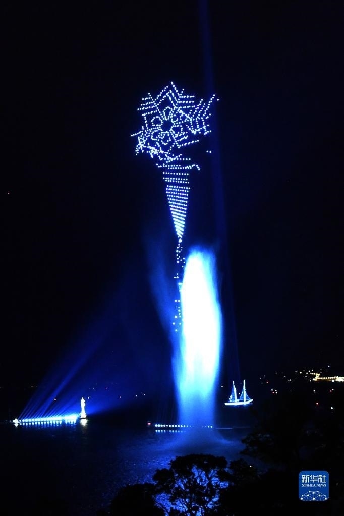 當(dāng)晚,無人機(jī)光影音樂秀在瑞士日內(nèi)瓦湖上舉行,超過1350架無人機(jī)點(diǎn)亮夜空,吸引市民駐足觀看。新華社記者 連漪 攝